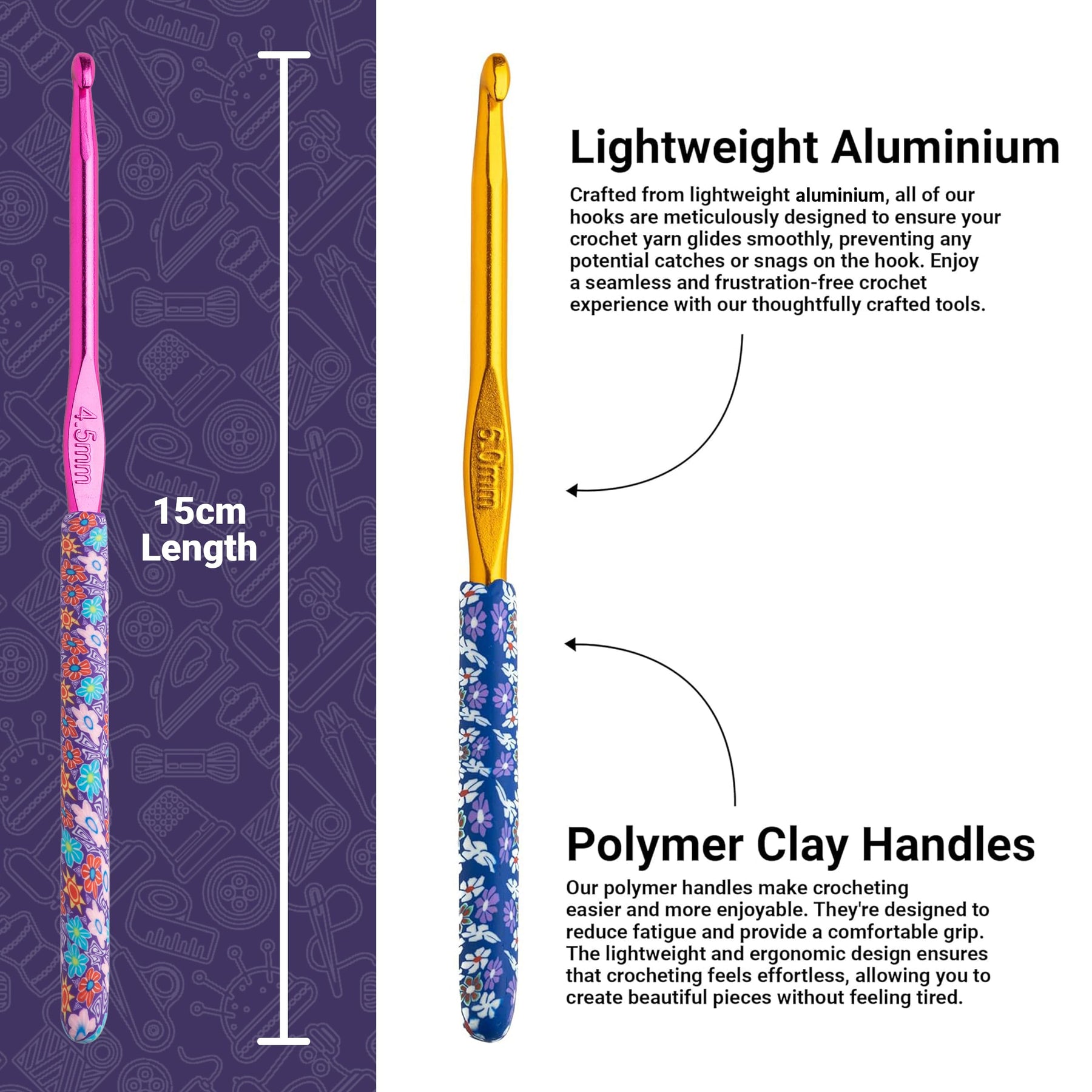- Polymer Clay Handle: Designed for comfort and to reduces stress on the hands and wrists. This reduces fatigue & makes them perfect crochet hooks for arthritic hands