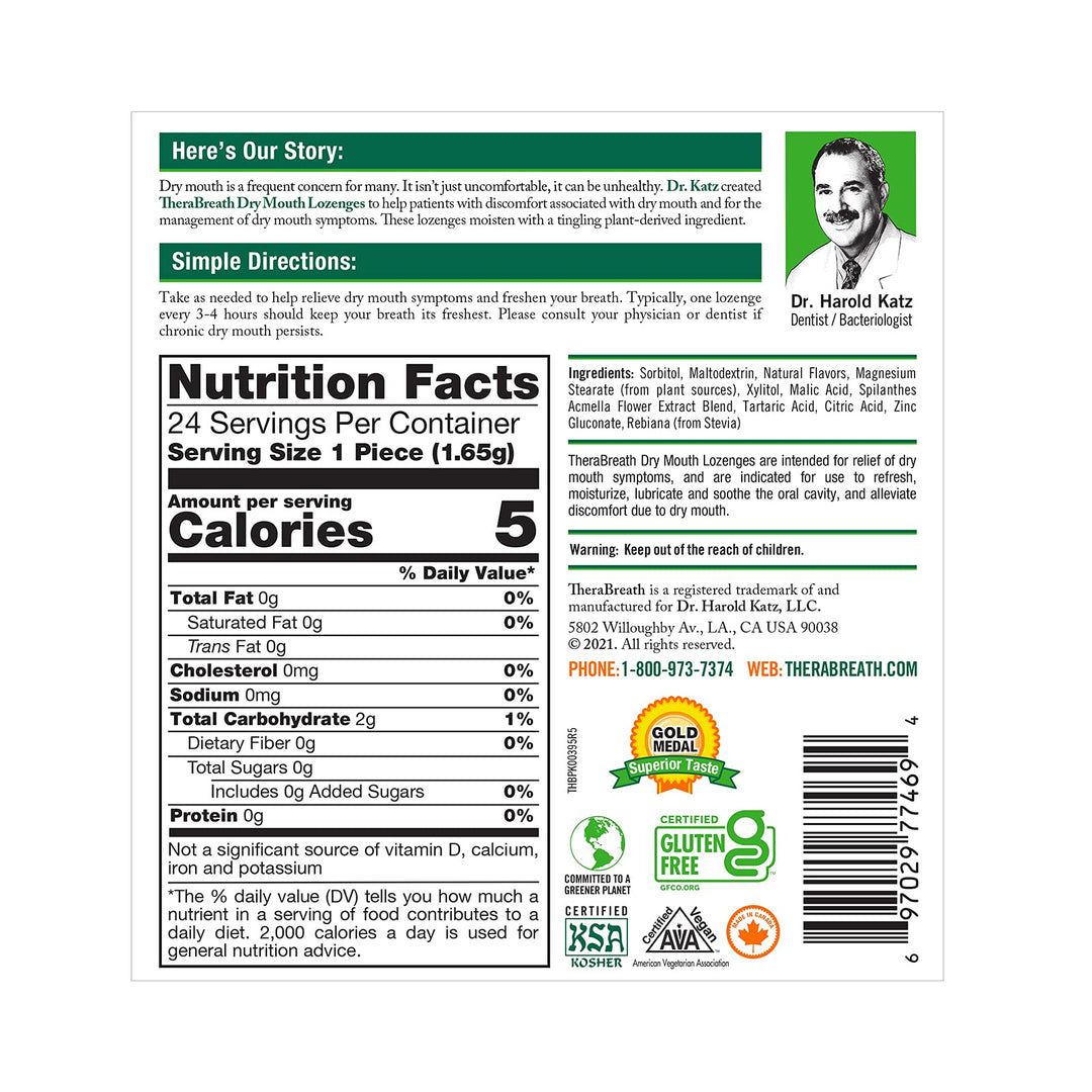 - Relieve Dry Mouth: TheraBreath's dentist formulated 3 step lozenge helps soothe dry mouth symptoms, freshen breath, and maintain moisture with a proprietary blend of natural flavors, mint, 3mg of ZINC and XYLITOL