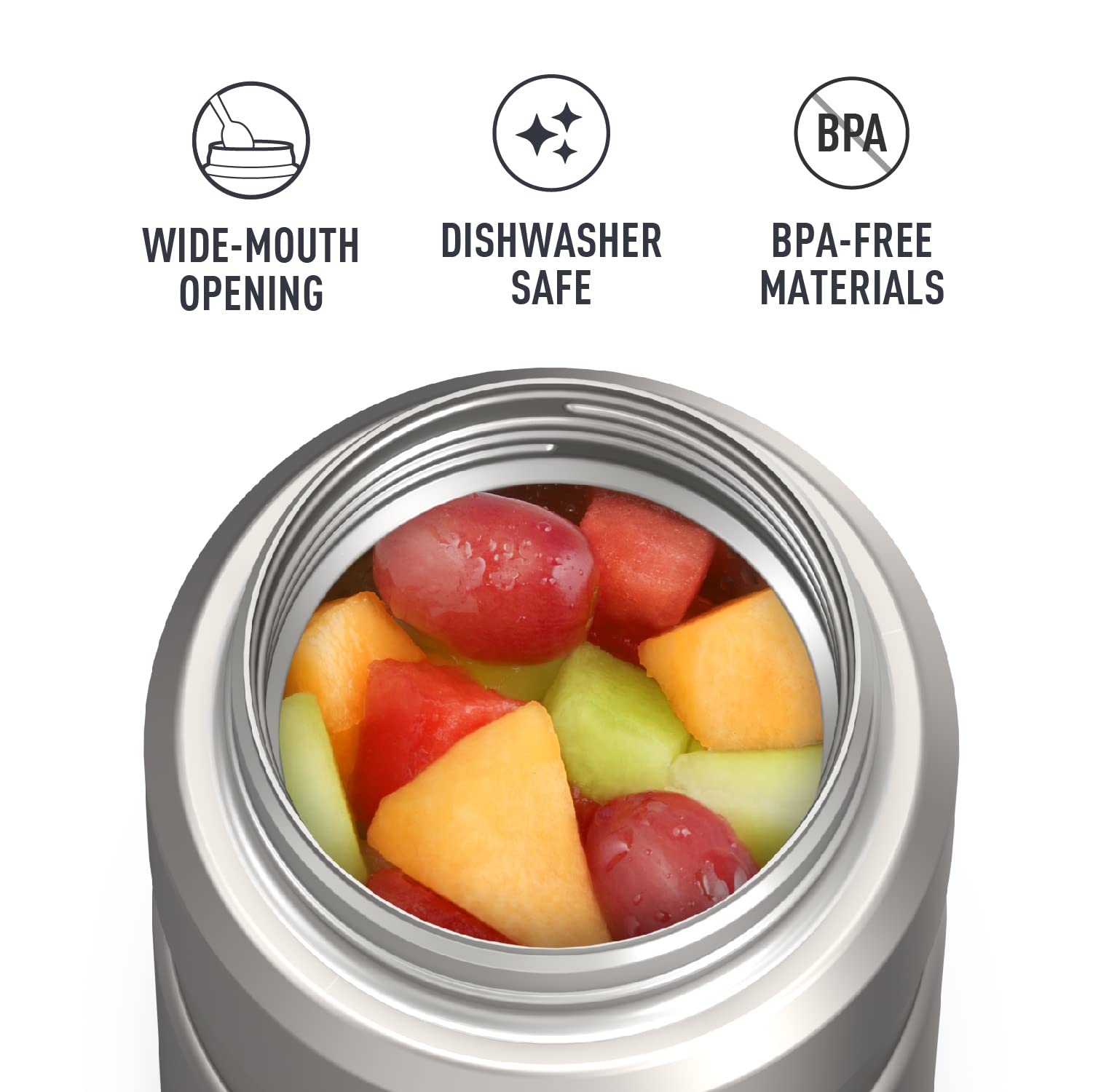 - SWEAT-PROOF: Exterior stays cools to the touch with hot contents and sweat-proof with cold. THERMOS brand food jars are dishwasher safe, top rack recommended