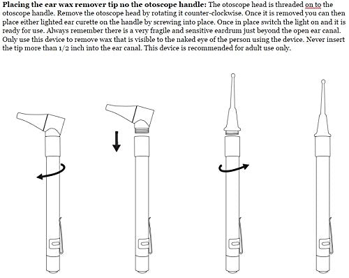 - ** Otoscope is for use in ALL ages but the Ear CURETTES are for ADULT use only *** PLEASE read the directions before use. The Lighted ear curettes do not attach to the otoscope head but to the otoscope handle.
