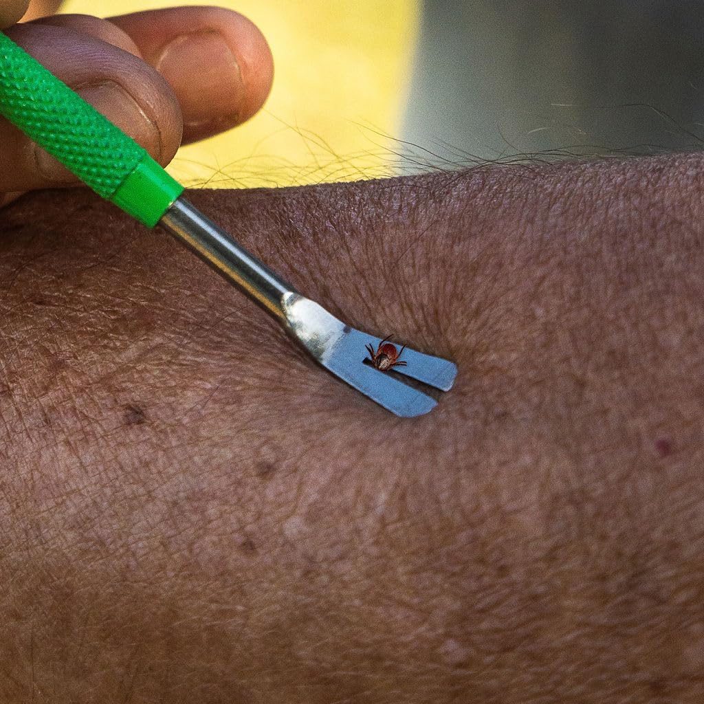 The tick removal fork can be used to gently and entirely remove larger embedded ticks by sliding the fork underneath the tick's mouthparts and lifting.