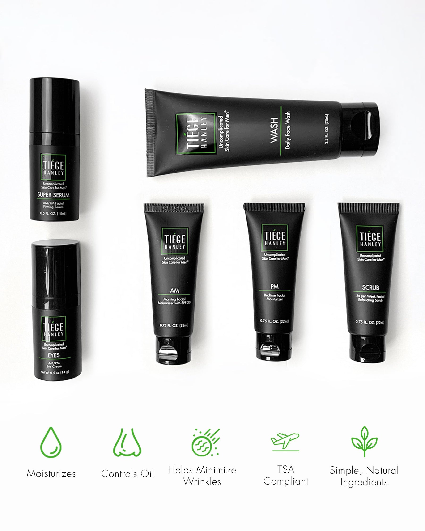 - Enhance Your Handsome: Items in the Tiege Hanley Anti-Aging Routine for Men work together to help smooth, hydrate, and protect your skin while fighting crow’s feet, dark circles, and fine lines. Includes face wash (2.5oz), exfoliating scrub (0.75oz), AM moisturizer with SPF20 (0.75oz), nighttime moisturizer (0.75oz), eye serum (0.5oz), anti-aging serum (0.5oz), and simplified usage guide. This Level 3 set provides a 30-day supply that’s great as a starter pack for you or a gift for someone else.