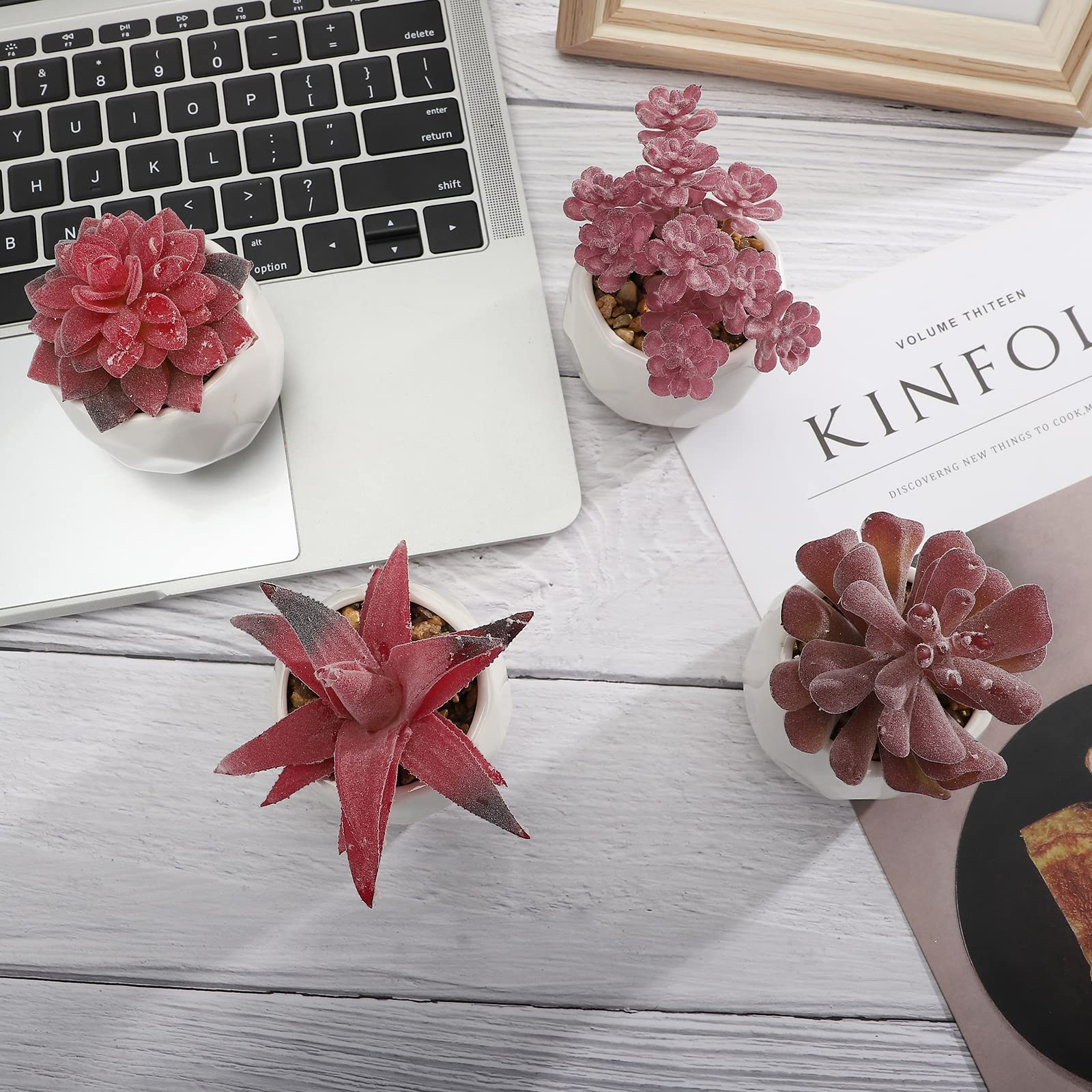 - Artificial Succulent Plants Set of 4 The life-like Mini Artificial succulents are paired with a white geometric ceramic pot, which is full of art. Elegant and beautiful appearance of these fake desk plants can make your home or office more warm.