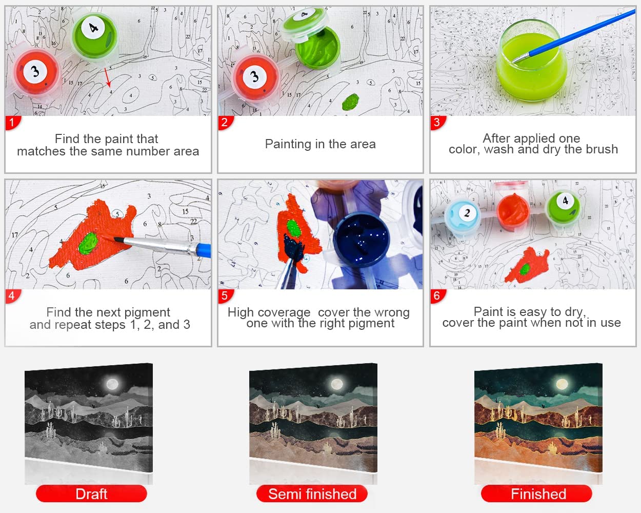 - Easy to Use: Paint by number kit are suitable for adults, children and beginners of all ages. Follow the instructions to writing painting and you can get a lot of fun from it.You complete the adult digital DIY paint and use it to decorate your room.