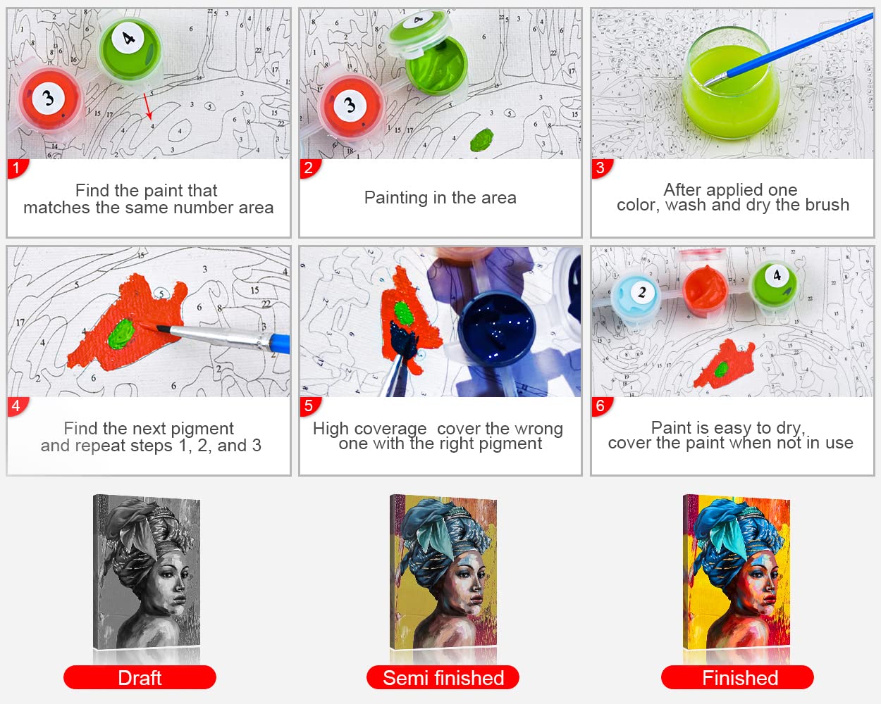 - Easy to Use: Paint by number kit are suitable for adults, children and beginners of all ages. Follow the instructions to writing painting and you can get a lot of fun from it.You complete the adult digital DIY paint and use it to decorate your room.