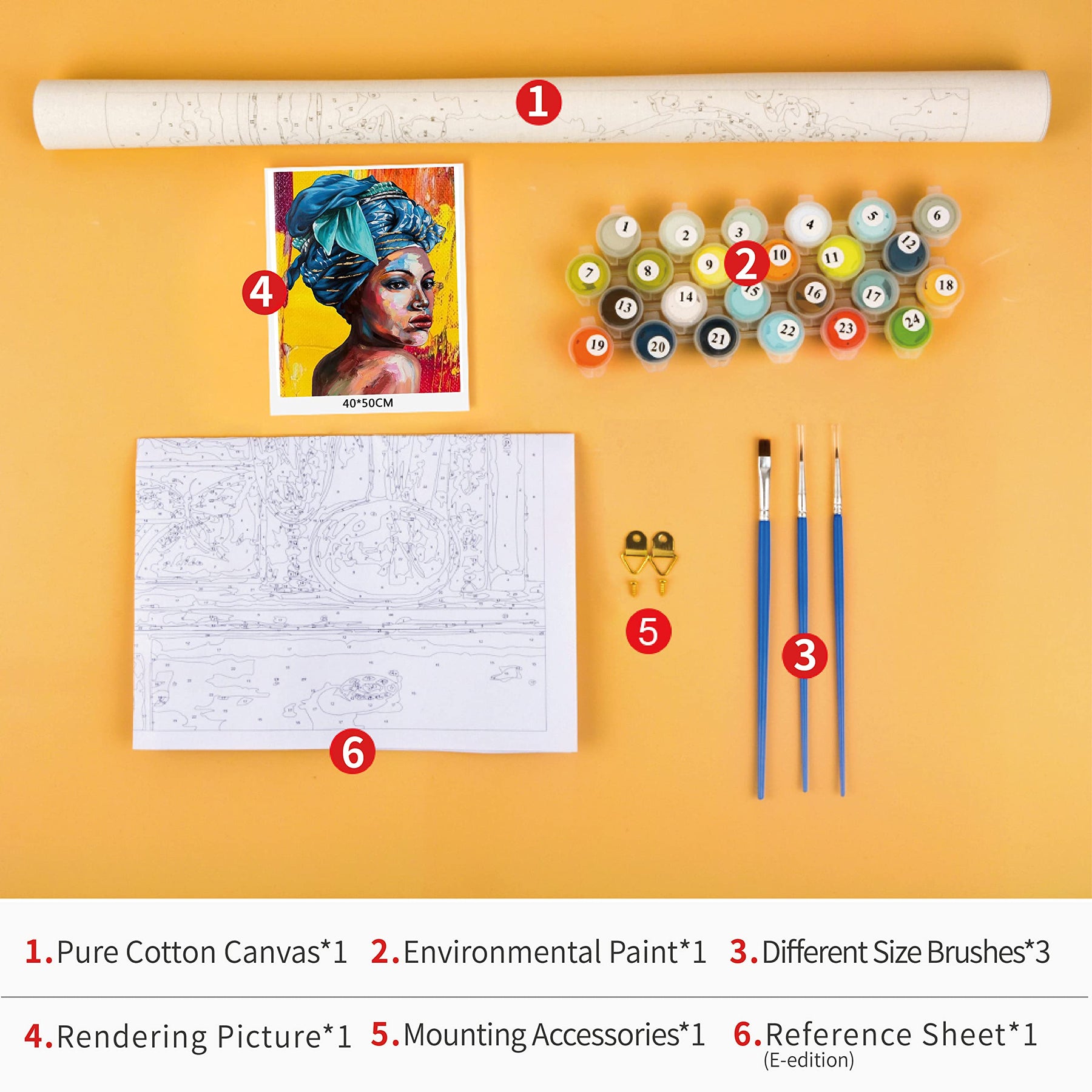 - What You Get: The adult paint by number packing with a high quality canvas(40*50cm), 1 set of acrylic pigment colors and 3 different size brushes for painting different sizes areas, nylon brush is easy to clean.
