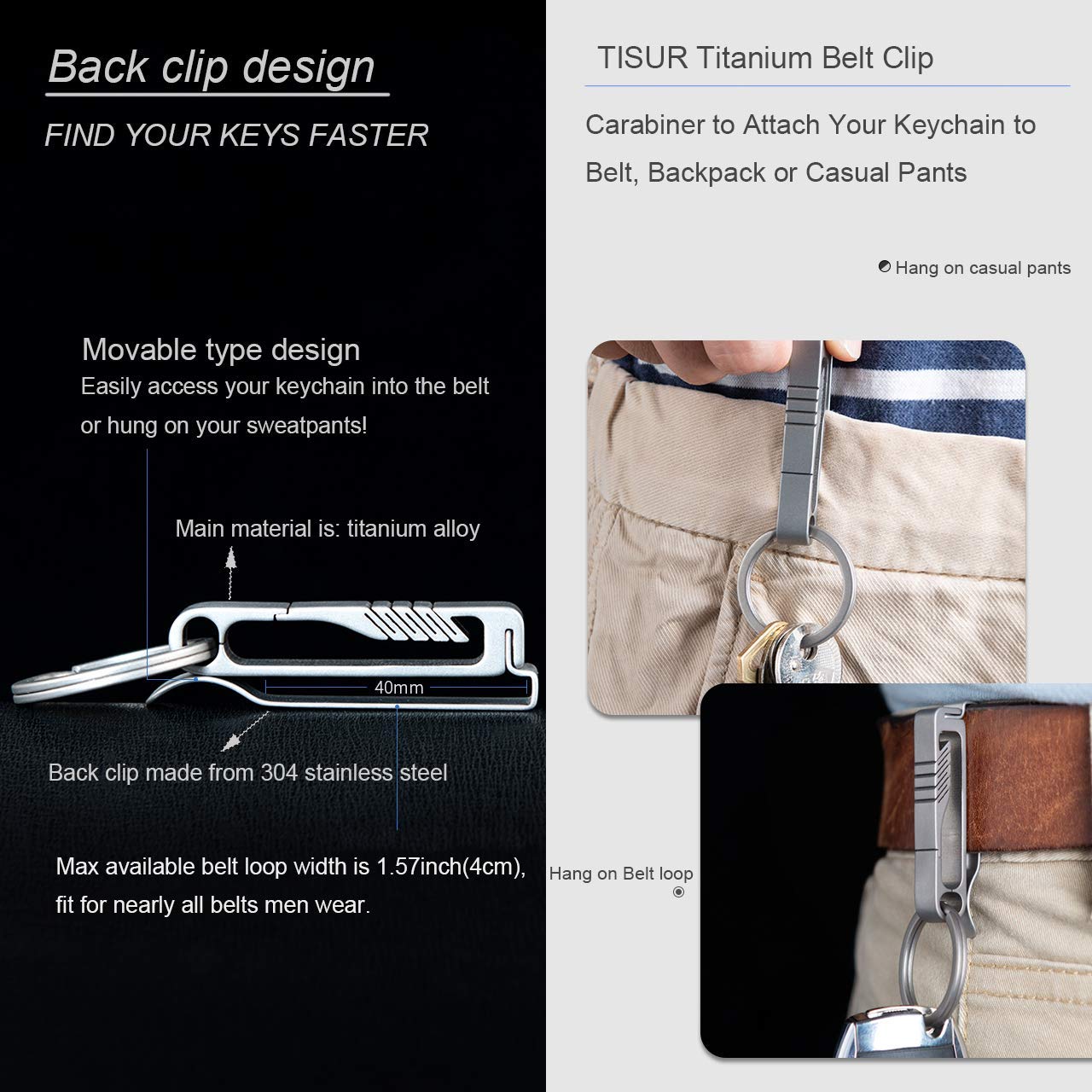 - Original Keyrings & Keychains – Belt Keychain Titanium Belt Loop Key Holder, Stainless Steel Back Clip, with Detachable Keyring for Men and Women by TISUR