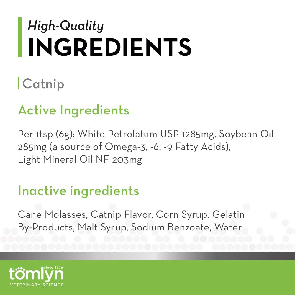 | ingredients | Active ingredients per 1tsp (6g): White Petrolatum USP 1285mg, Soybean oil 285mg (a source of Omega-3, -6, -9 Fatty Acids), Light Mineral Oil NF 203mg. Inactive ingredients: Cane Molasses, Catnip Flavor, Corn Syrup, Gelatin By-Products, Malt Syrup, Sodium Benzoate, Water. |