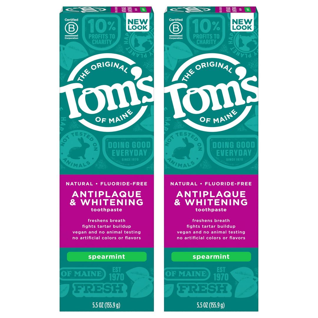- WHAT YOU'LL GET: Two 5.5-ounce tubes of Tom's of Maine Natural Fluoride-Free Antiplaque & Whitening Toothpaste in Spearmint Flavor