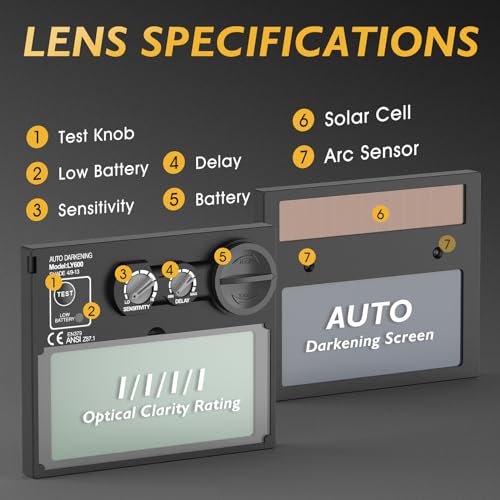- Built in sensitivity,delay control adjustment knob and low voltage alarm.Auto darkening shade range DIN4/9-13.