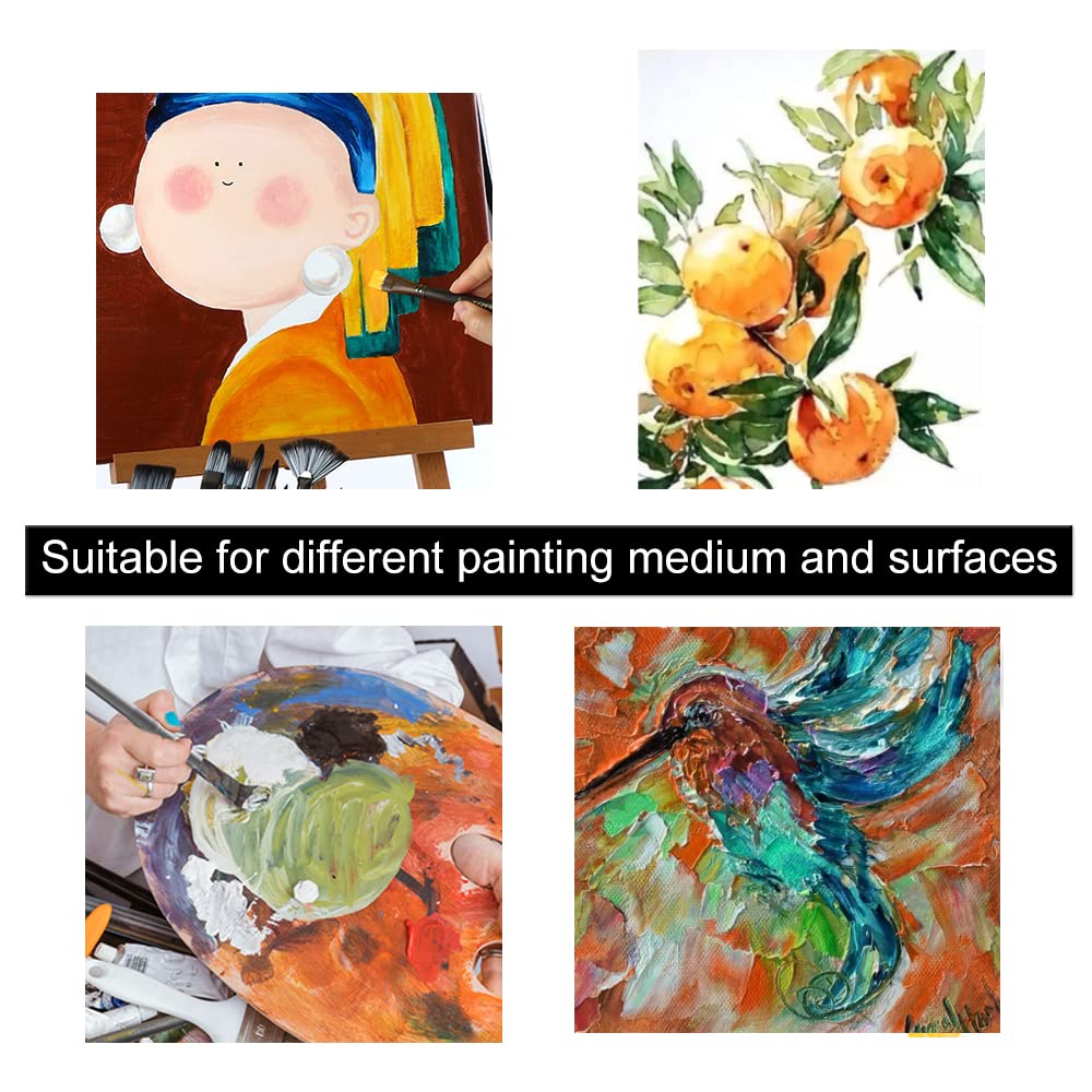 - The brushes tips are made of synthetic bristles, flexible and snappy, they are suitable for acrylic, watercolor, gouache, ink, oil, tempera painting.