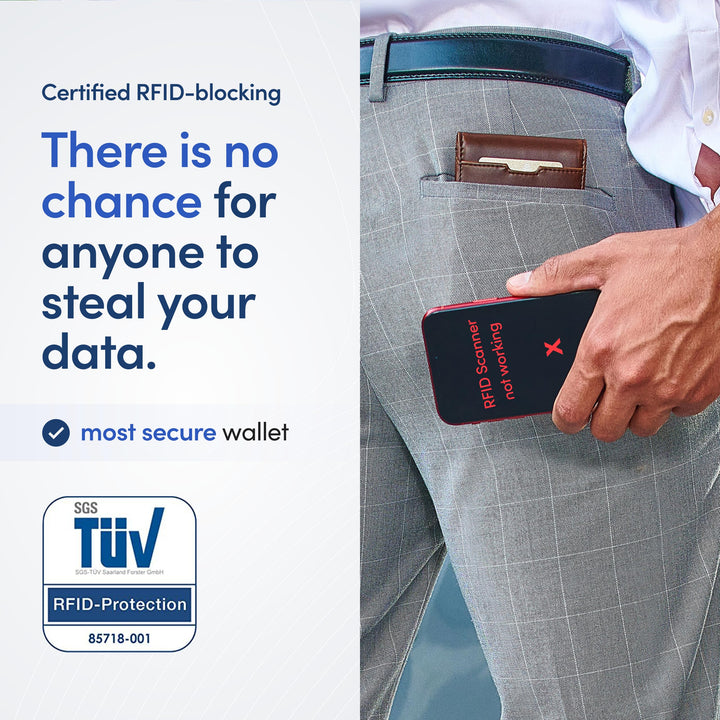 - - - Tested by an independent German quality control institute. Our wallets block the 13.56 MHz band and protect against data theft by RFID scanners