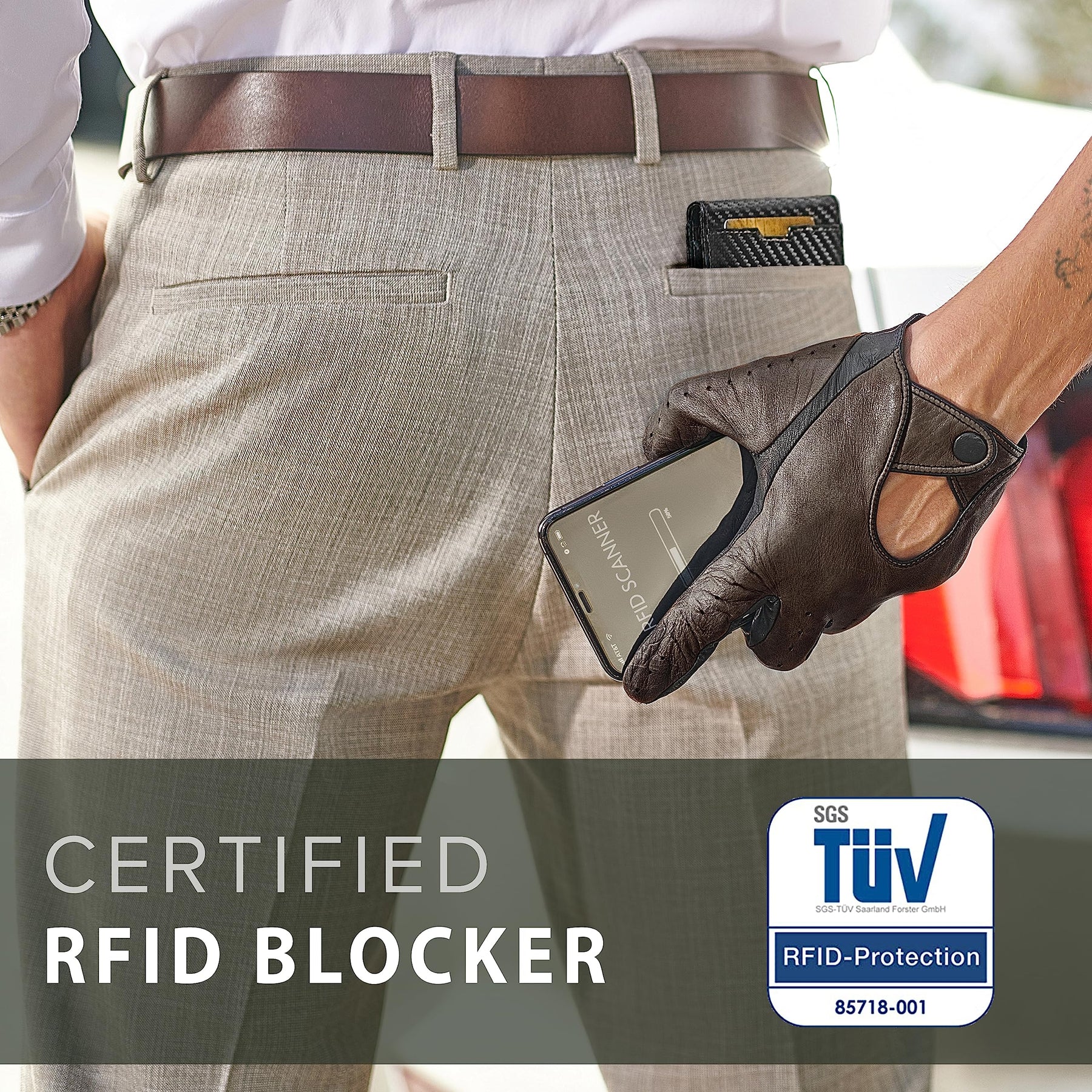 - - - Tested by an independent German quality control institute. Our wallets block the 13.56 MHz band and protect against data theft by RFID scanners
