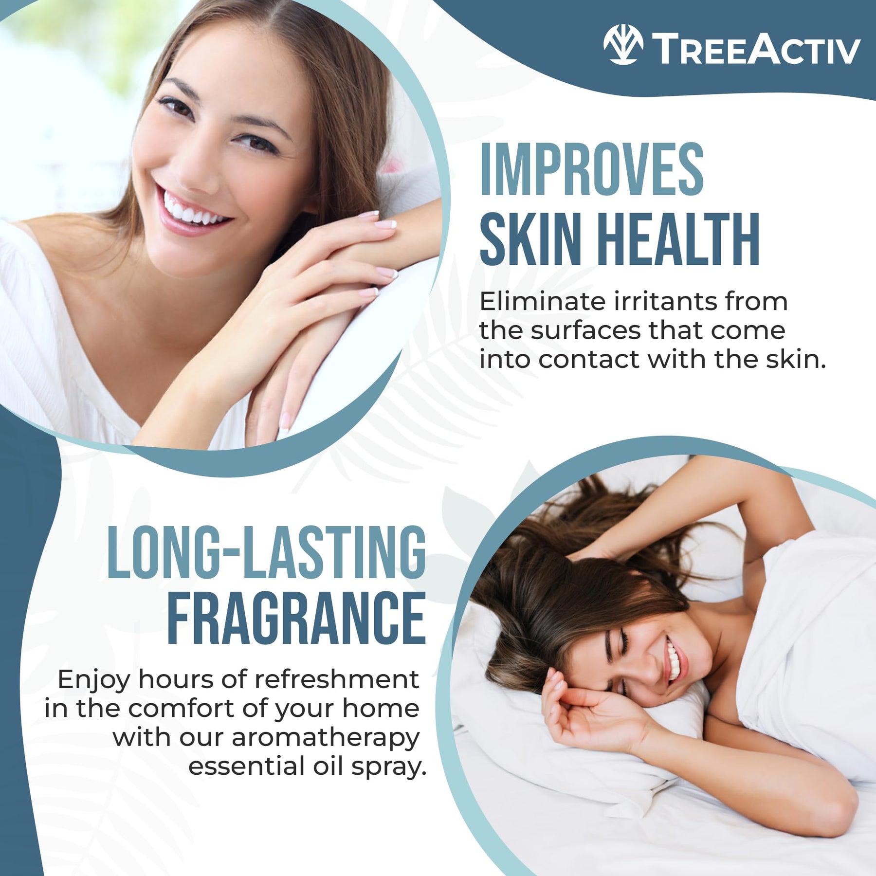 TreeActiv's Anti-Acne Pillow and Linen Mist is a bed linen spray freshener for sleep enrichment. Experience the ultimate relaxation with our spray for pillows. Transform your sleep environment into a serene haven by using our lavender pillow spray or lavender linen spray. Drift into a deep slumber as the delicate scent of lavender lulls you into tranquility. Our pillow sprays offer a luxurious touch, ensuring a restful and rejuvenating night's sleep.