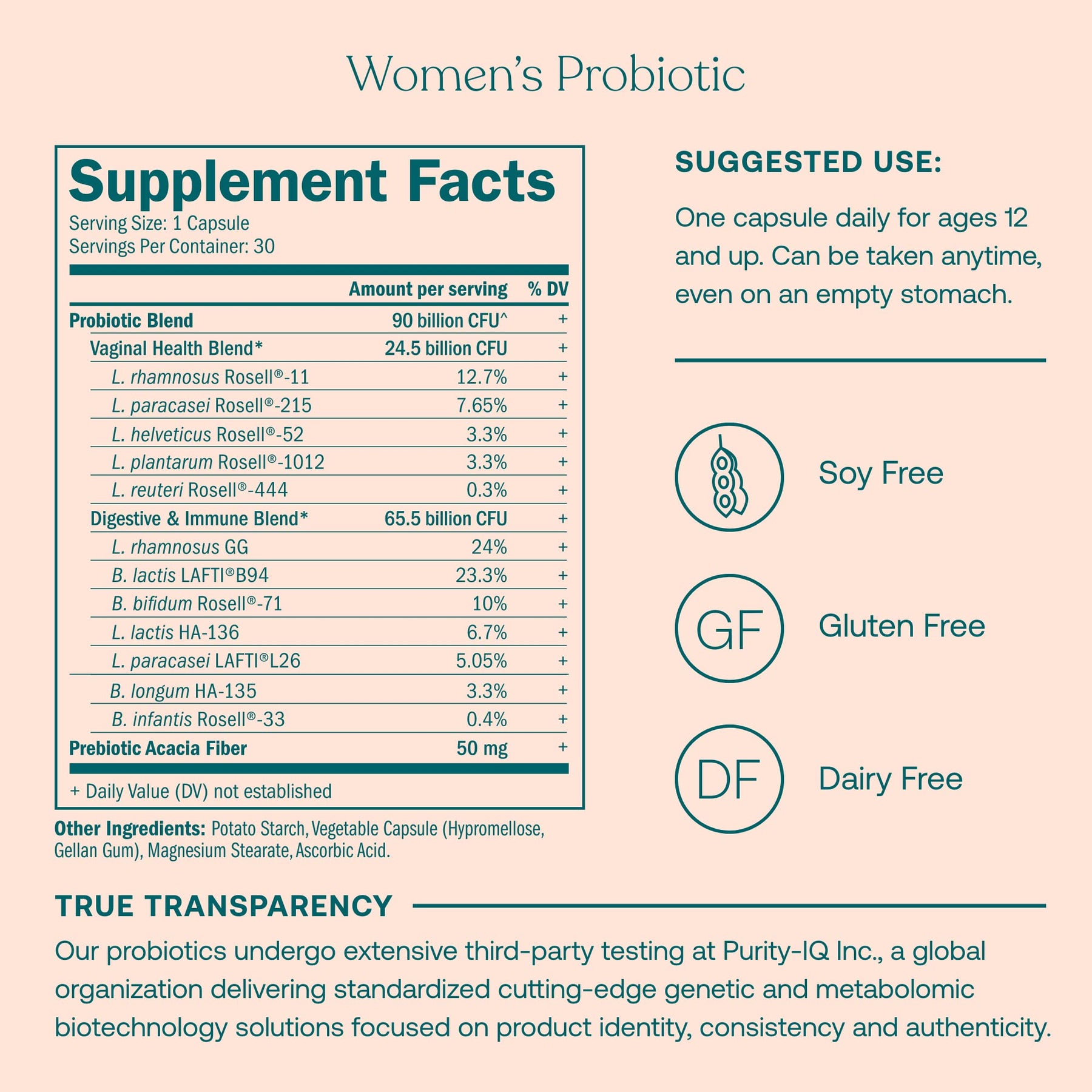 - WOMEN’S PROBIOTIC - Each probiotic strain has been carefully selected and combined in specic, consistent ratios. A blend of 12 DNA-veried probiotic cultures to support digestion & immune health. With L. rhamnosus Rosell to help restore a healthy balance of bacteria in the vaginal microbiome and a plant-based Acacia prebiotic ber, known to be gentle on the stomach. Prebiotics are “food” for probiotics and help them thrive.