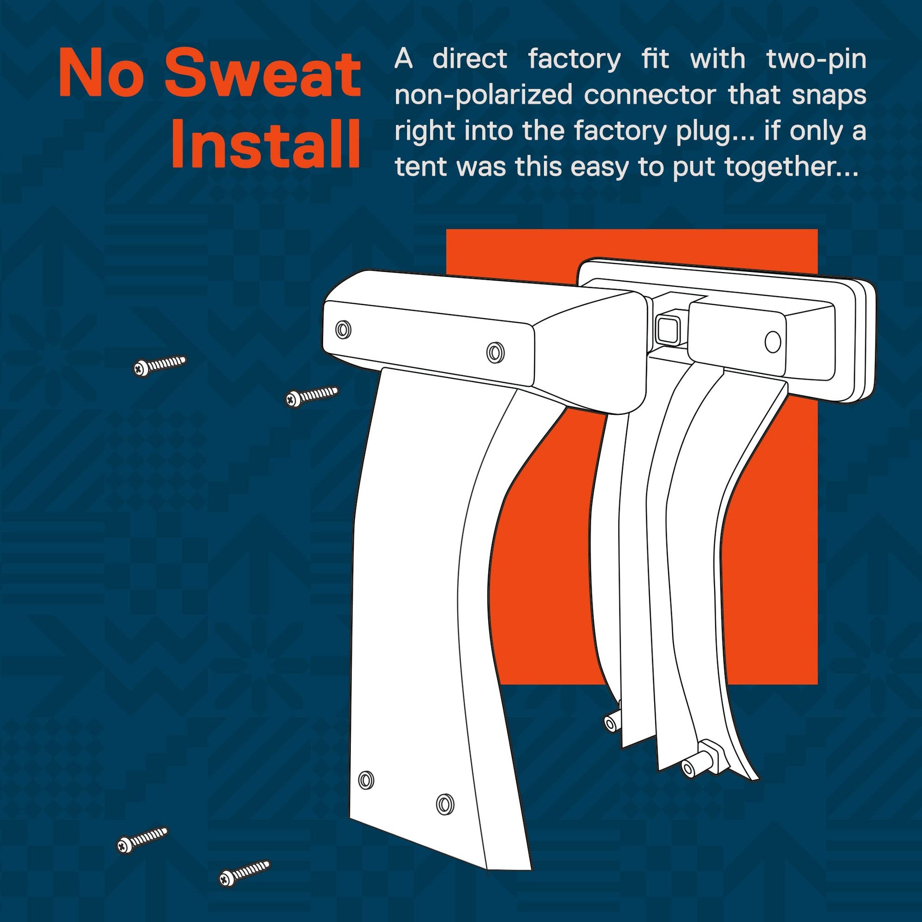 - NO SWEAT INSTALL - A direct factory fit with two-pin non-polarized connector that snaps right into the factory plug... if only a tent was this easy to put together.