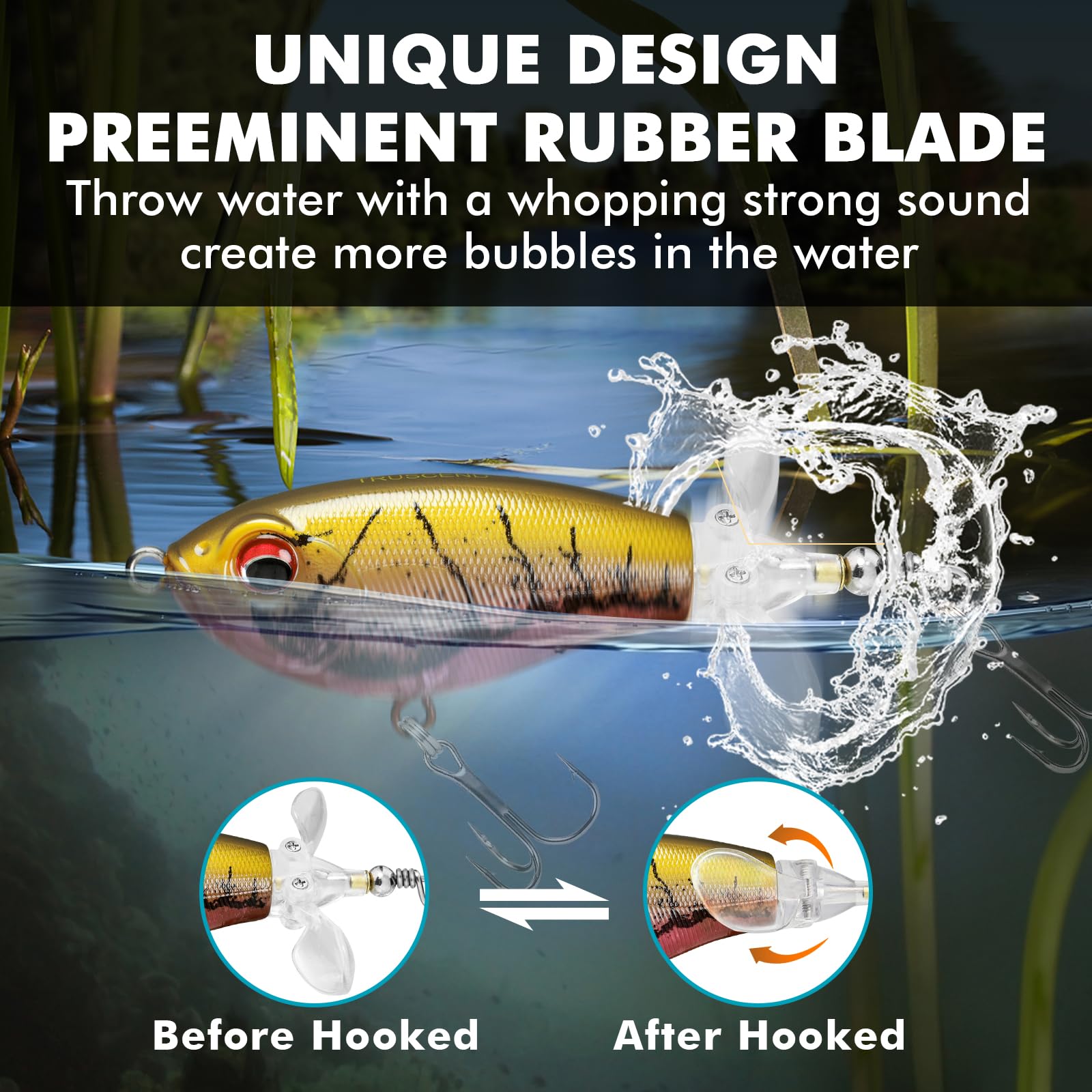 - DOUBLE-BLADE UNIQUE DESIGN - TRUSCEND fishing lures for bass uses a double-blade rotating tail design, which delivers a heavy sputter as it moves across the surface, create noise and commotion that fish can not ignore. It also roll resistant and works well at a variety of speeds. Interestingly, when the monster bass bites the top water fishing lures, its tail will close to prevent the bass from spitting it out.