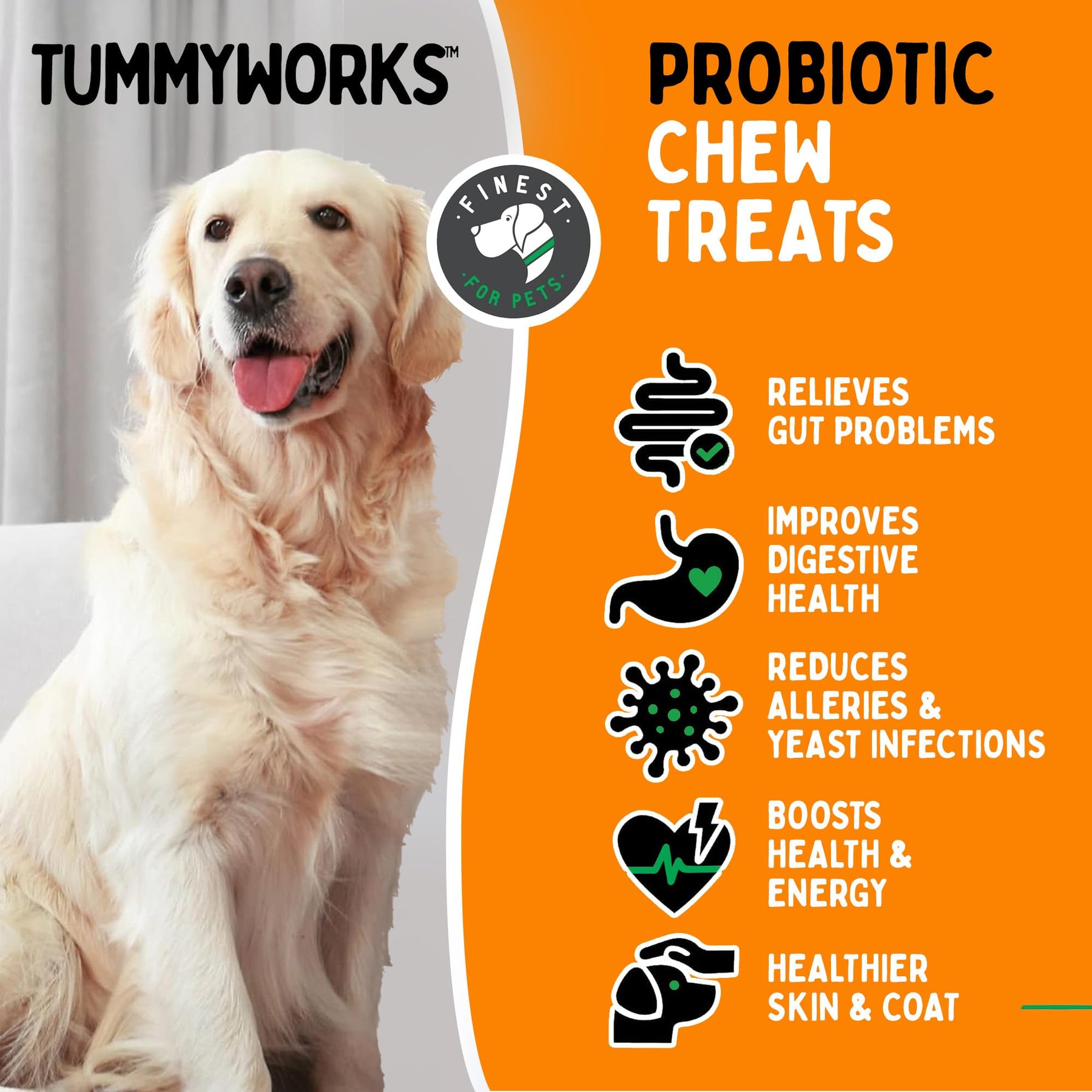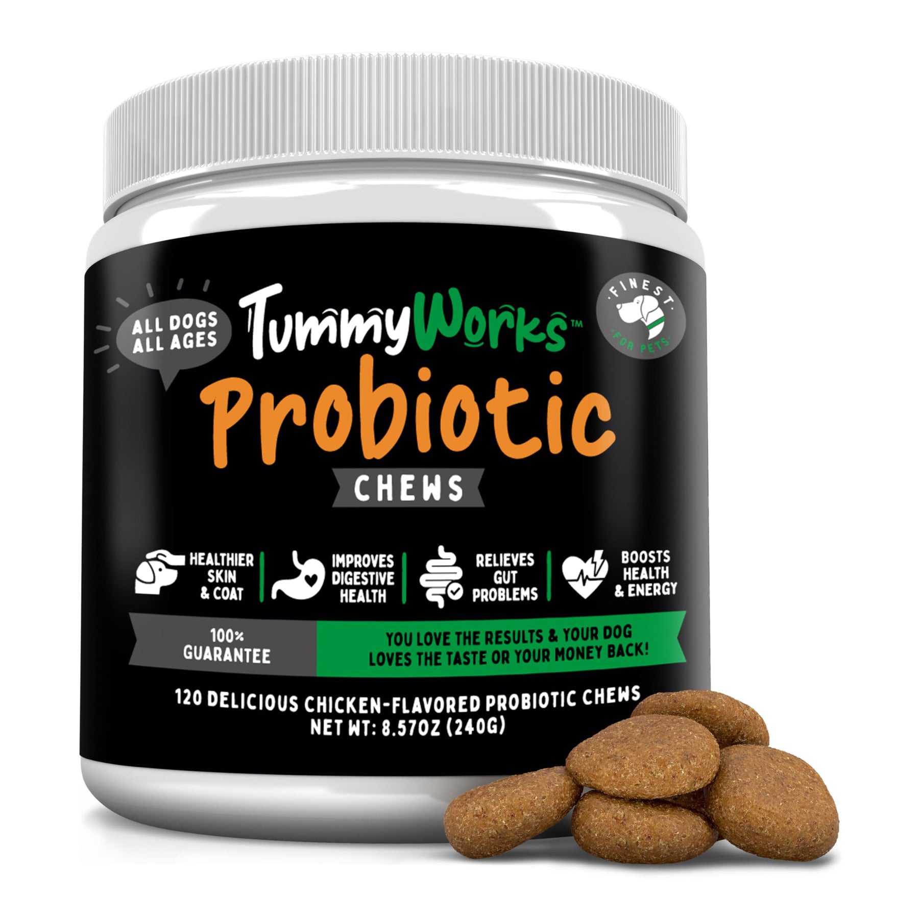 - Original Probiotics – TummyWorks Probiotic 120 Soft Chews for Dogs All Ages - Supports Digestive Health, Relieves Diarrhea, Constipation, Good for Itching, Allergies, Yeast Infections. Added Digestive Enzymes, Made in USA by Finest For Pets