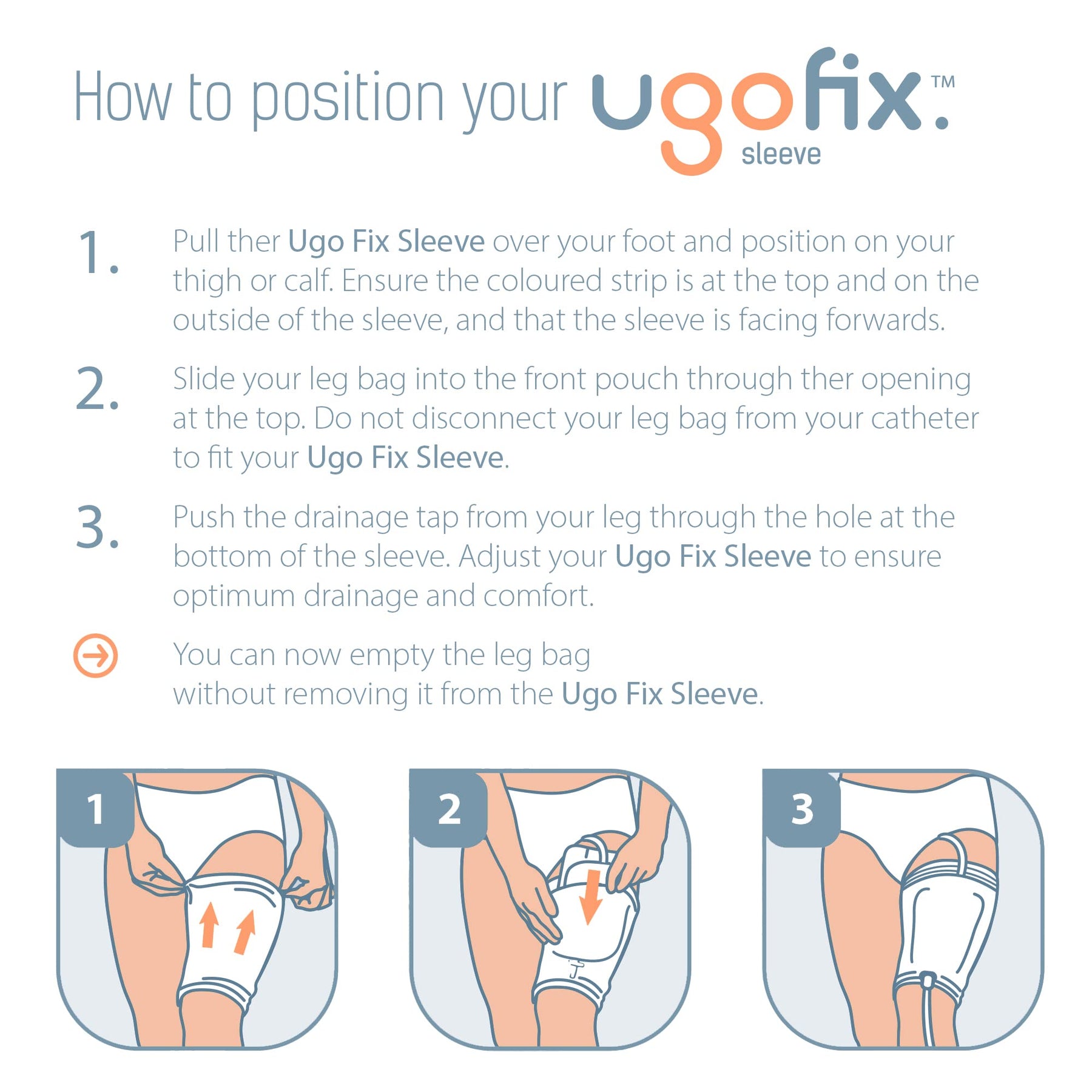- The Ugo Fix Sleeve keeps your leg bag in a secure pocket, away from the skin for extra comfort.