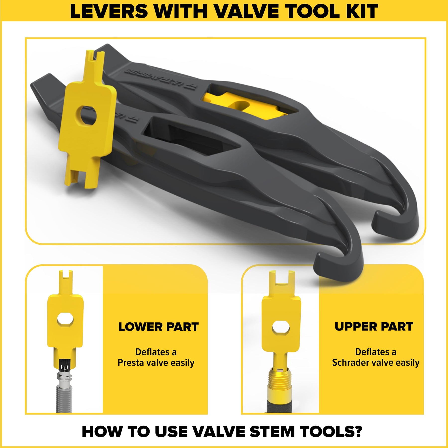 - Tire Lever Pro Tool Kit - Quick and Easy Installation, pry and close ties in with little to no effort, reducing the inner tube installation time by as much as 50%