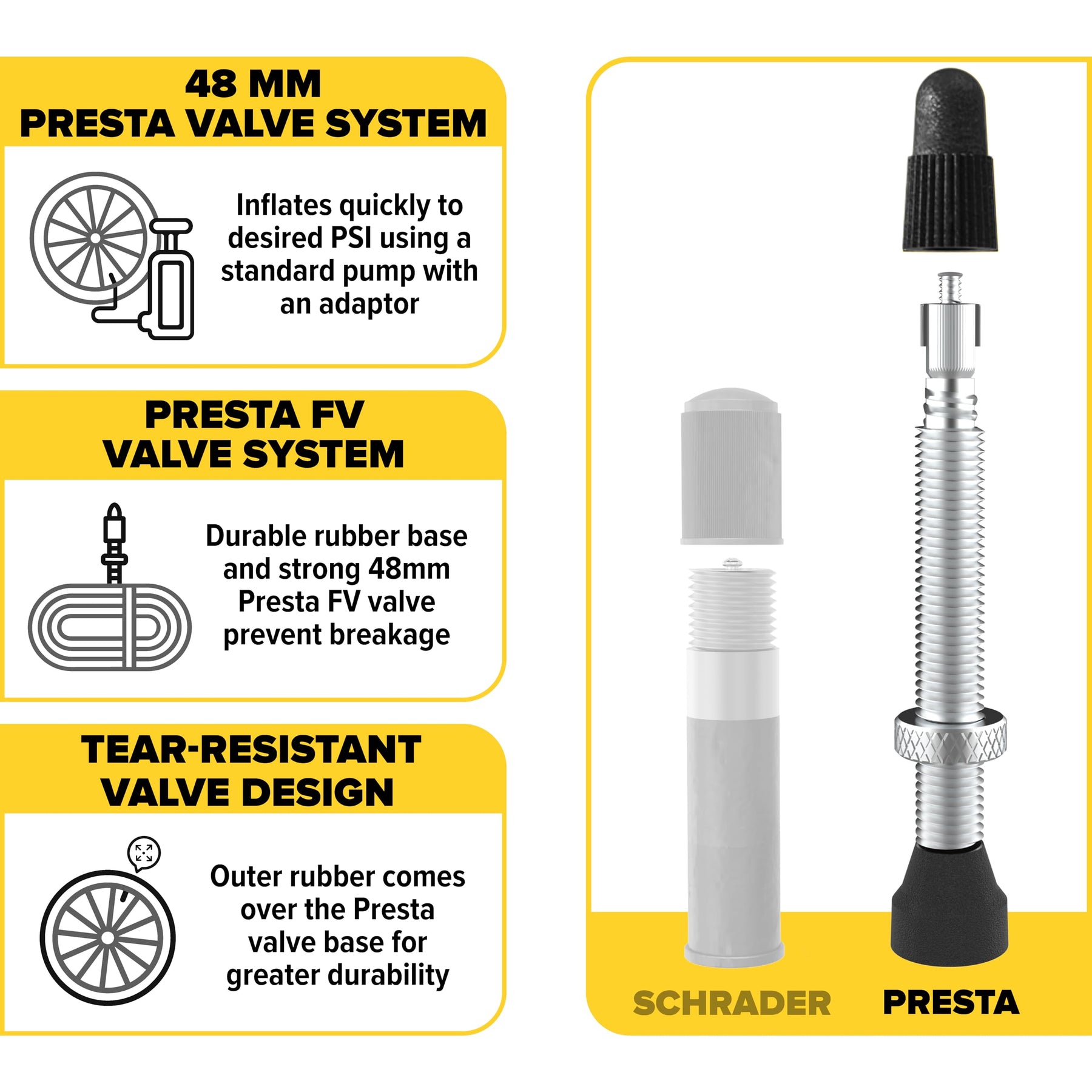 - Presta Valve – The heavy duty reinforced rubber base and extremely robust 48mm FV Valve prevents shearing off while cycling
