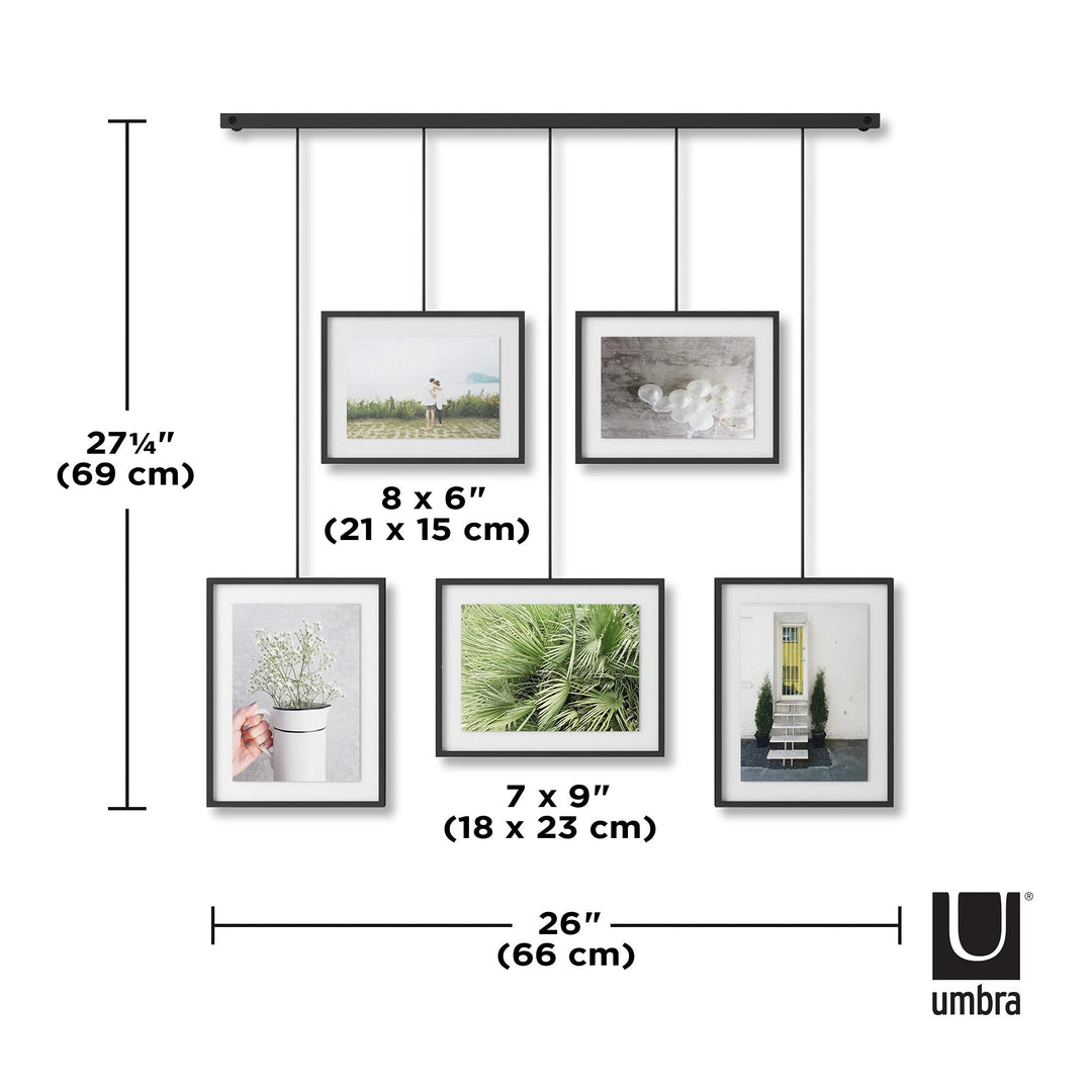 - MULTI-PHOTO WALL DISPLAY Display your favorite photos in an eye-catching fashion using these five hanging, gallery-style frames suspended from a modern and sleek beam; features two 4x6 and three 5x7 picture frames