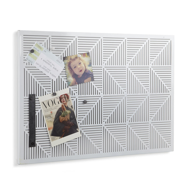 - DUAL SURFACE, MULTI PURPOSE: Trigon features a metal panel with perforated geometric pattern over a layer of EVA foam that allows you to put up notes and pictures using either magnets or pushpins (included)