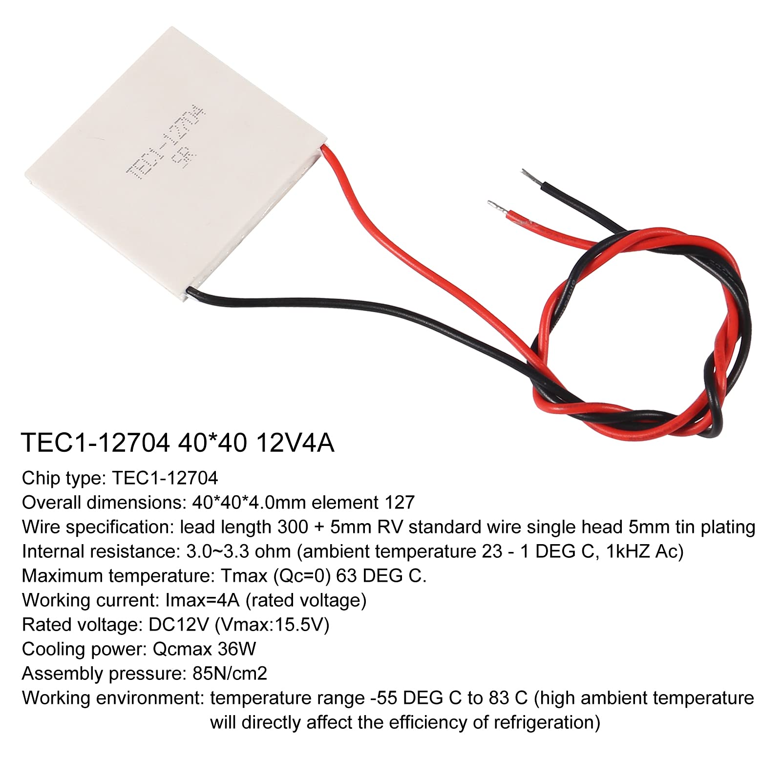 - Imax: 4A; Vmax: 15V; Rated Voltage: 12V;Qcmax: 37W; Tmax: 67°C