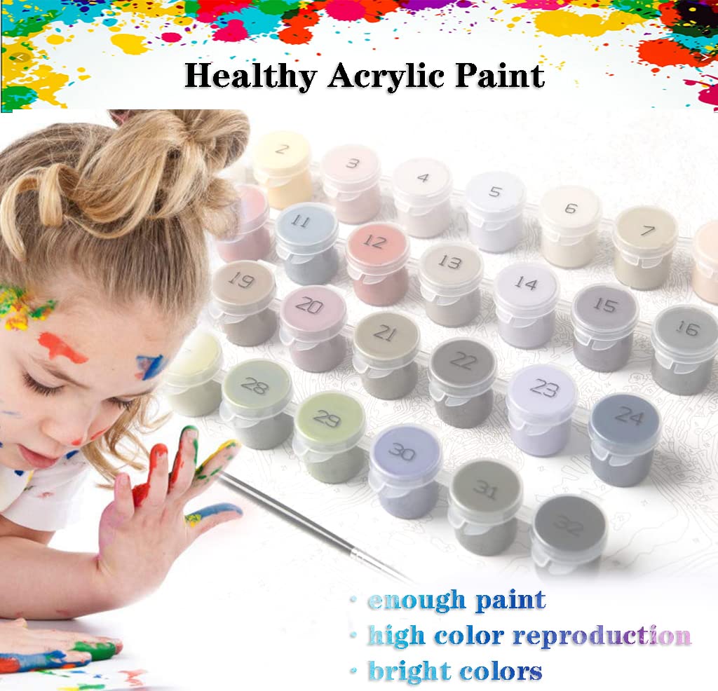 - Healthy materlalsOur paint by number pigment is acrylic paint, non-toxic and harmless, safe for kids or adults. The canvas made of linen, has good water absorption and breath ability, easy to store for a long time.
