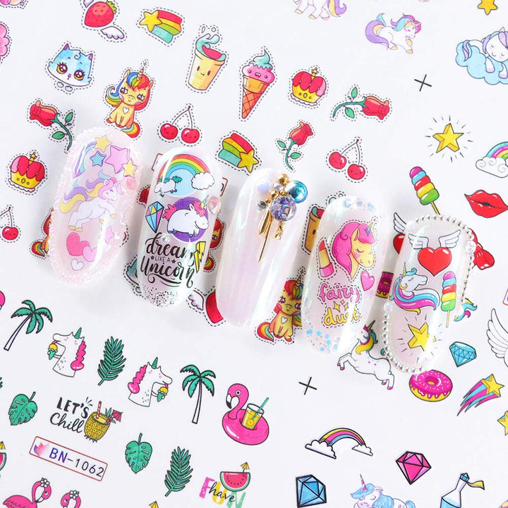 - Assorted Designs: Lovely nail decals have many patterns of unicorn, star, moon, rainbow, ice cream, flamingo, sun, cherry, etc.