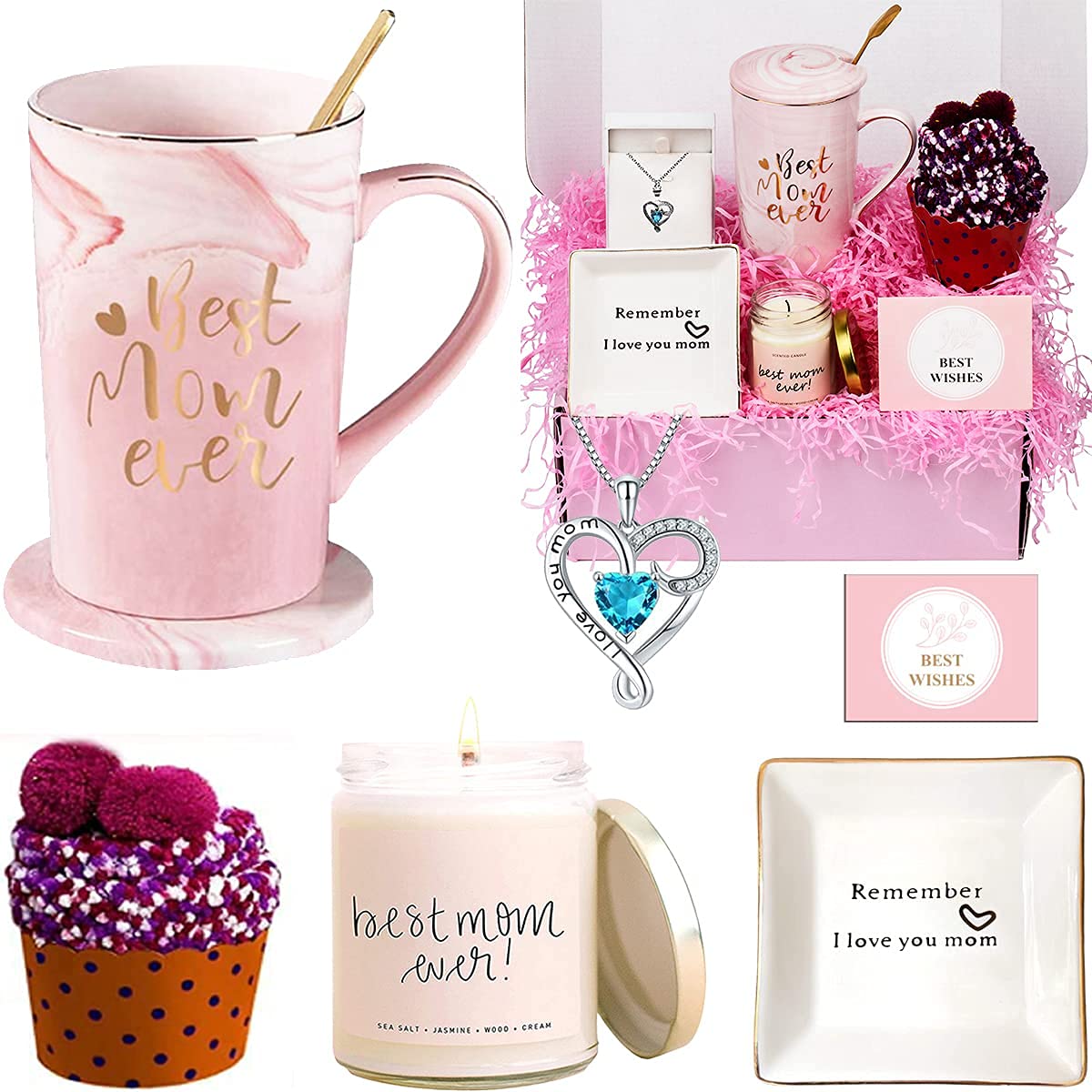 - MOM GIFTS SET PACK - 8-piece birthday gifts for mom worth $95, NOW ONLY $59.99! - A BEST MOM EVER mug with a lid and a golden spoon valued at $23, a handmade engraved necklace valued at $25, a jewelry dish valued at $17, a pair of cupcake socks valued at $10, a scented candle valued at $15, and a greeting card valued at $5. Perfect gifts for mom christmas unique for the fabulous mom in your life! Individually birthday gift boxed for mom that is sure to bring a smile.