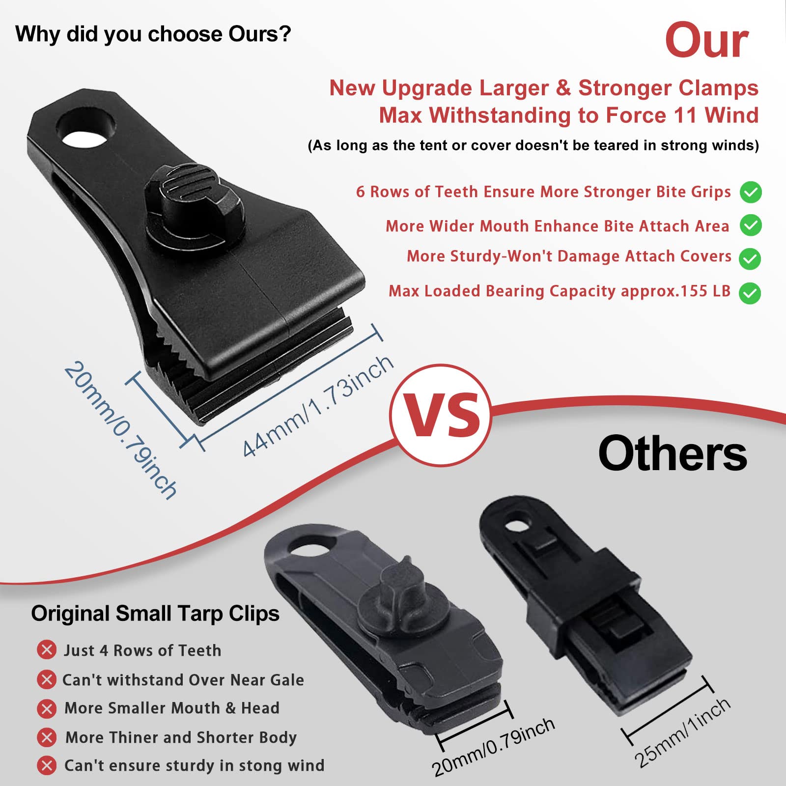 - Function of Tarp Clips: The High-strength heavy duty tarps tent clamps are Ideal for holding up tarp, canopy, boat cover, rainfly, bike cover, car/truck cover, pergola cover, kennel tarps clips, swimming pool covers, transport cover clips, camping awning clips, temporary shelters, tarp tie down clips etc