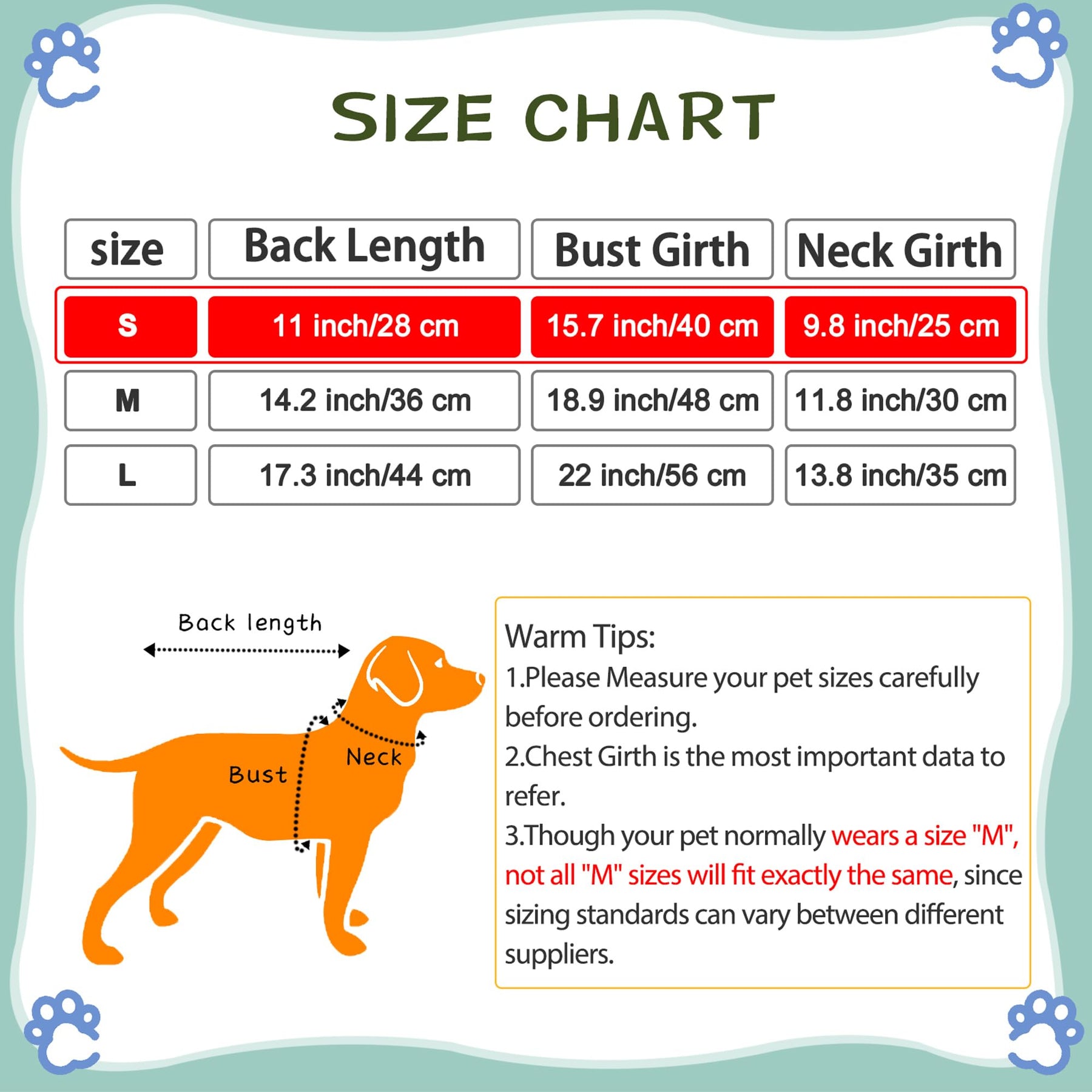 - Small size: the bust is 40 cm/15.7 inches, the back length is 28 cm/11 inches, the neck circumference is 25 cm/9.8 inches; please carefully measure your pet's figure before buying to avoid inappropriate size