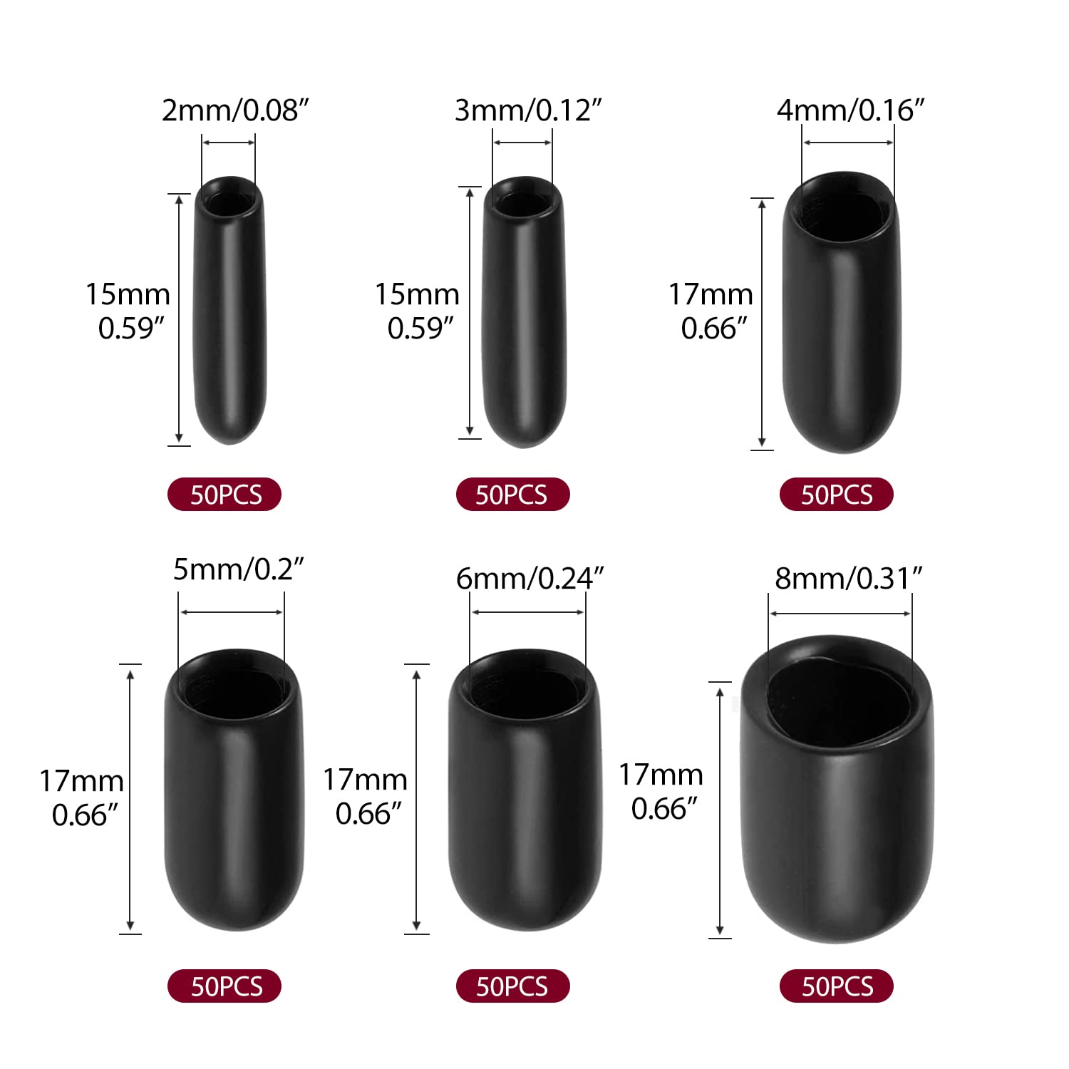 - 2,3,4,5,6,8,INNER DIAFive sizes Inner Dia Black Vinyl Round End Cap Covers,50 pieces of each size 300 pieces in total