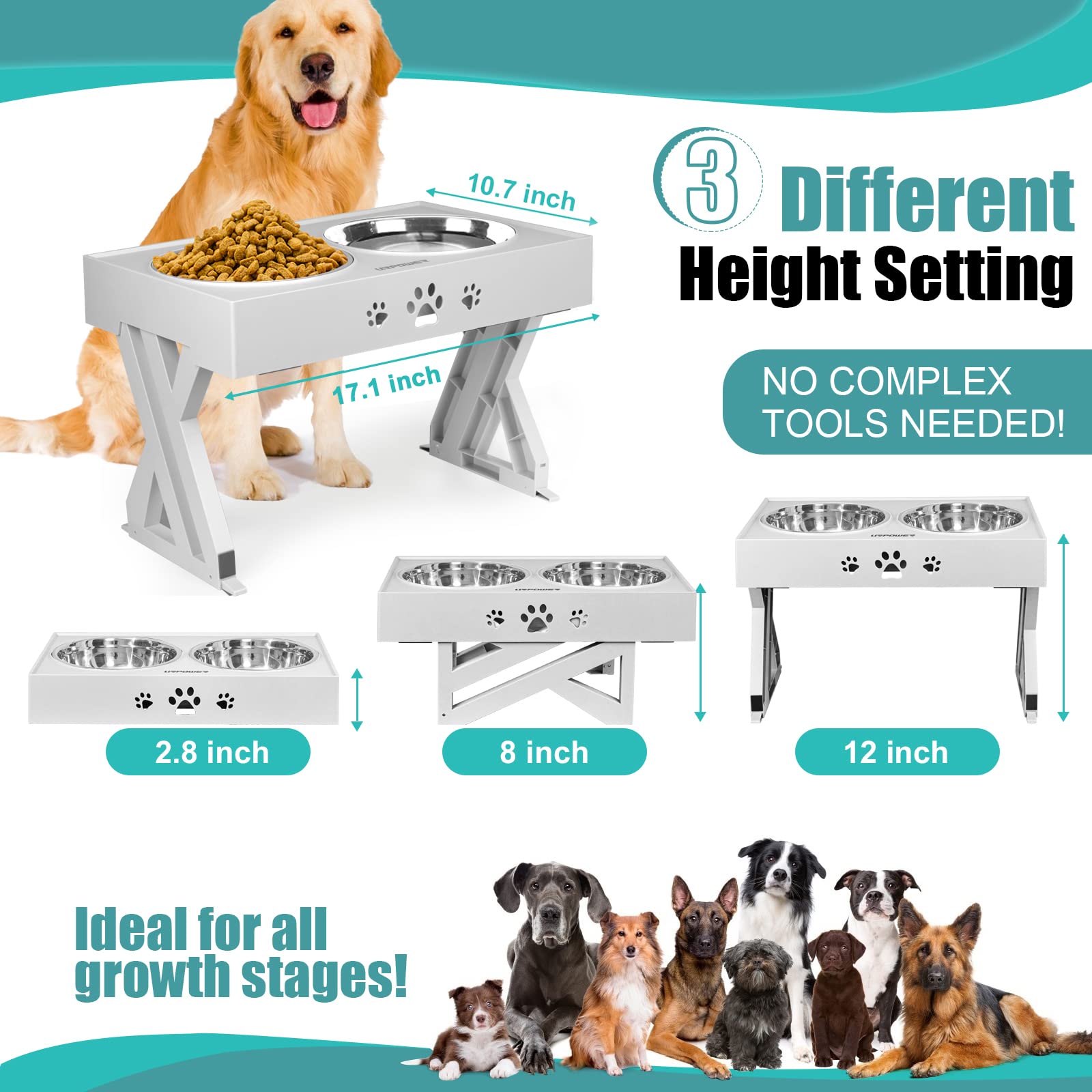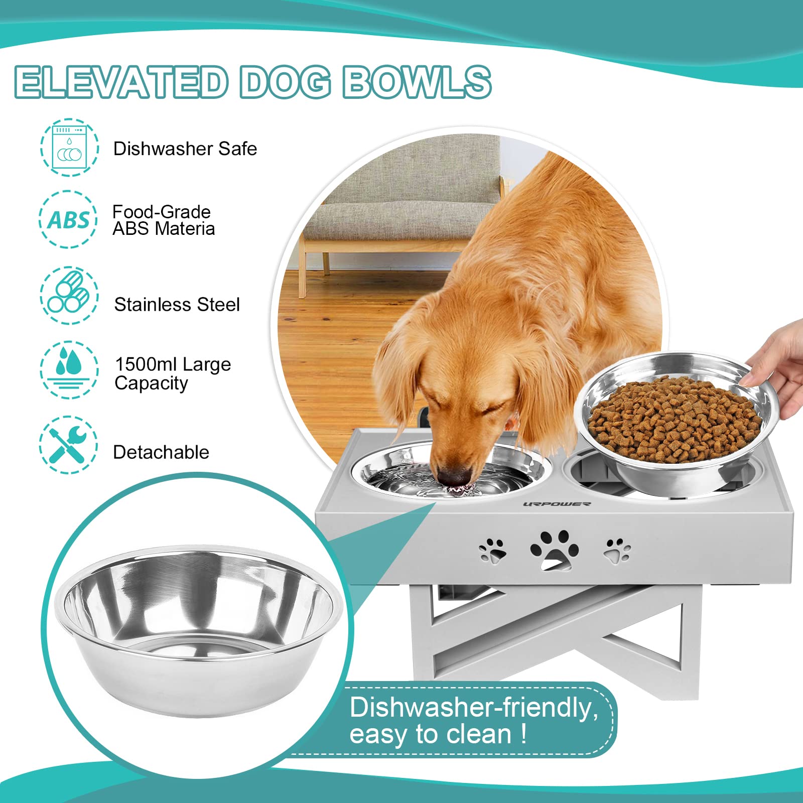 - Original Raised Bowls – Elevated Dog Bowls Adjustable Raised Dog Bowl with 2 Stainless Steel 1.5L Dog Food Bowls Stand Non-Slip No Spill Dog Dish Adjusts to 3 Heights 2.8”, 8”, 12”for Small Medium Large Dogs and Cats by URPOWER
