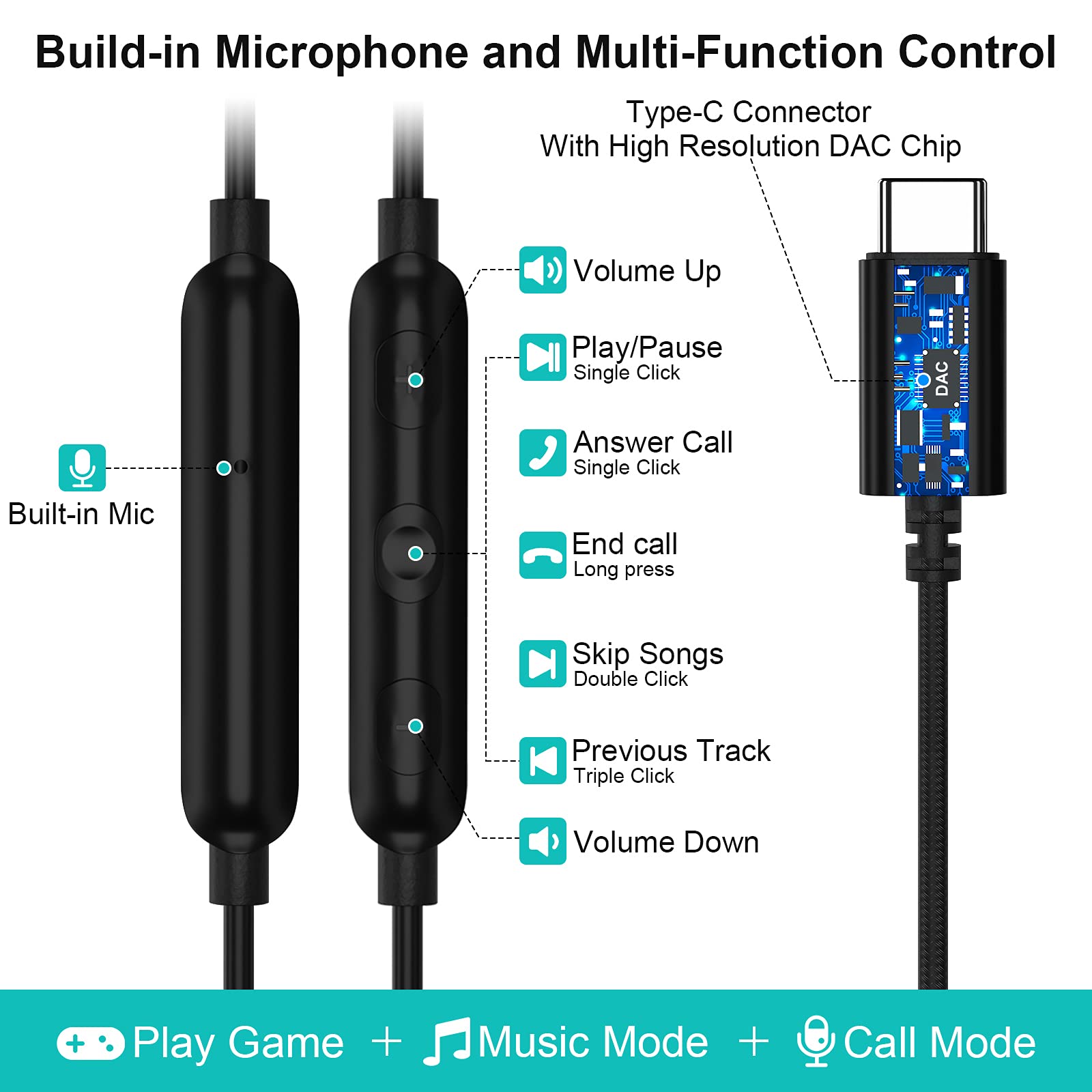 TITACUTE USB C headphones Wired Earbuds Type C Earphones With Microphone & Volume Control