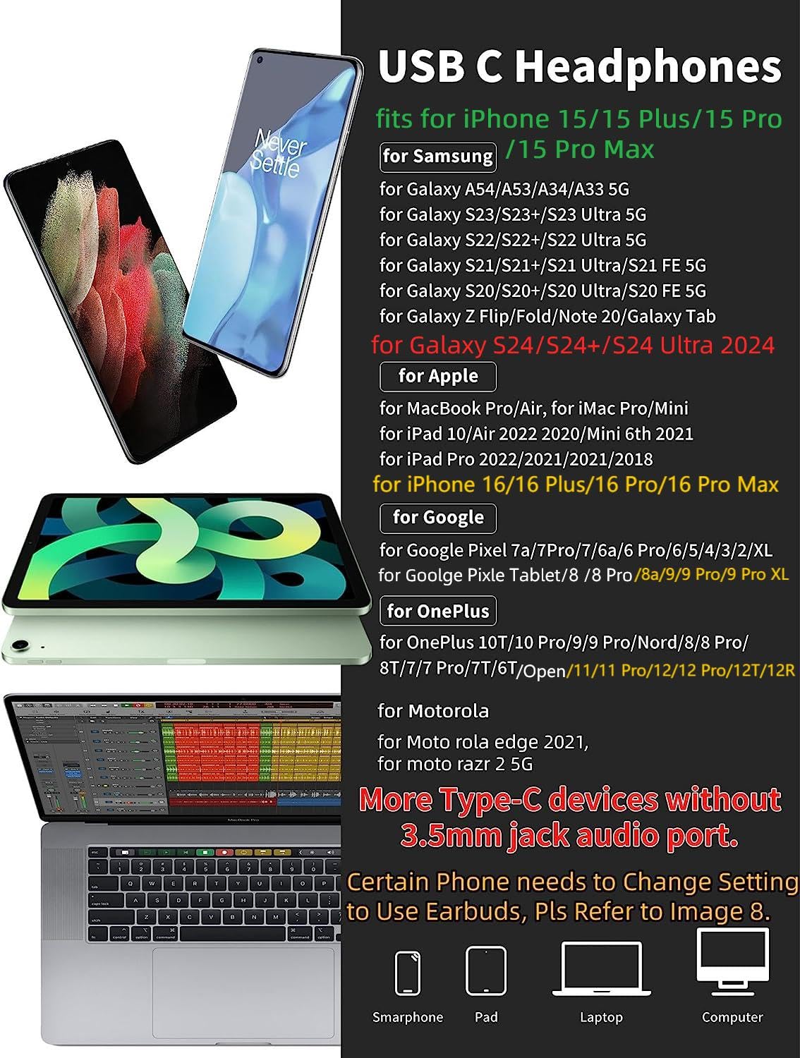 - USB C headphones for iPhone 16/16 Pro/16 Plus/16 Pro Max/15/15 Plus/15 Pro/15 Pro Max,for Samsung S24/S24+/S24 Ultra,for Google Pixel 9 Pro XL 8 7a 7 6a 6,Z Flip/Fold,S23 FE/S23/S23+/S23 Ultra,A35/A53/A54/A33/A34,S22/S22+/S22 Ultra/S21 FE/S21/S21+/S21 Ultra/S20 FE/S20 Ultra/S20+/S20,Tab S9/S8/S7/S6/S5e/Note 20,for OnePlus 10T/10 Pro/9/Nord/8T/8/7T/7,for Macbook Pro/Air,for iPad 10/Air 4 5 6/Mini 6/Pro 2023/2022/2021/2020,for motorola edge 2021,for Nothing Phone,Type C device without 3.5mm jack