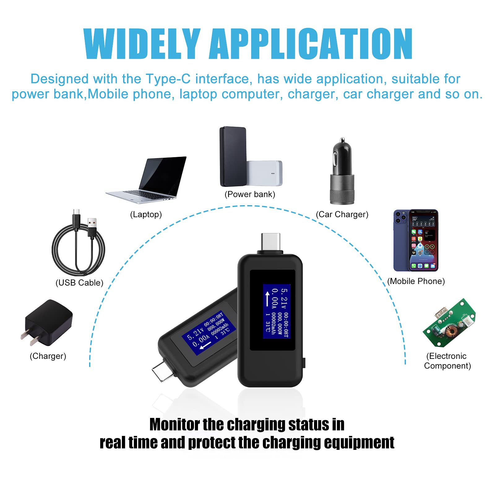- The type-C USB tester can save 9 sets of charge data,real-time detection of the charging status, voltage, current, power, and internal temperature of electrical appliances, and supports the identification of QC2.0, QC3.0, and Type-C interface fast charging protocols, compatible with USB C laptops and various charging mobile phone plugs,etc.
