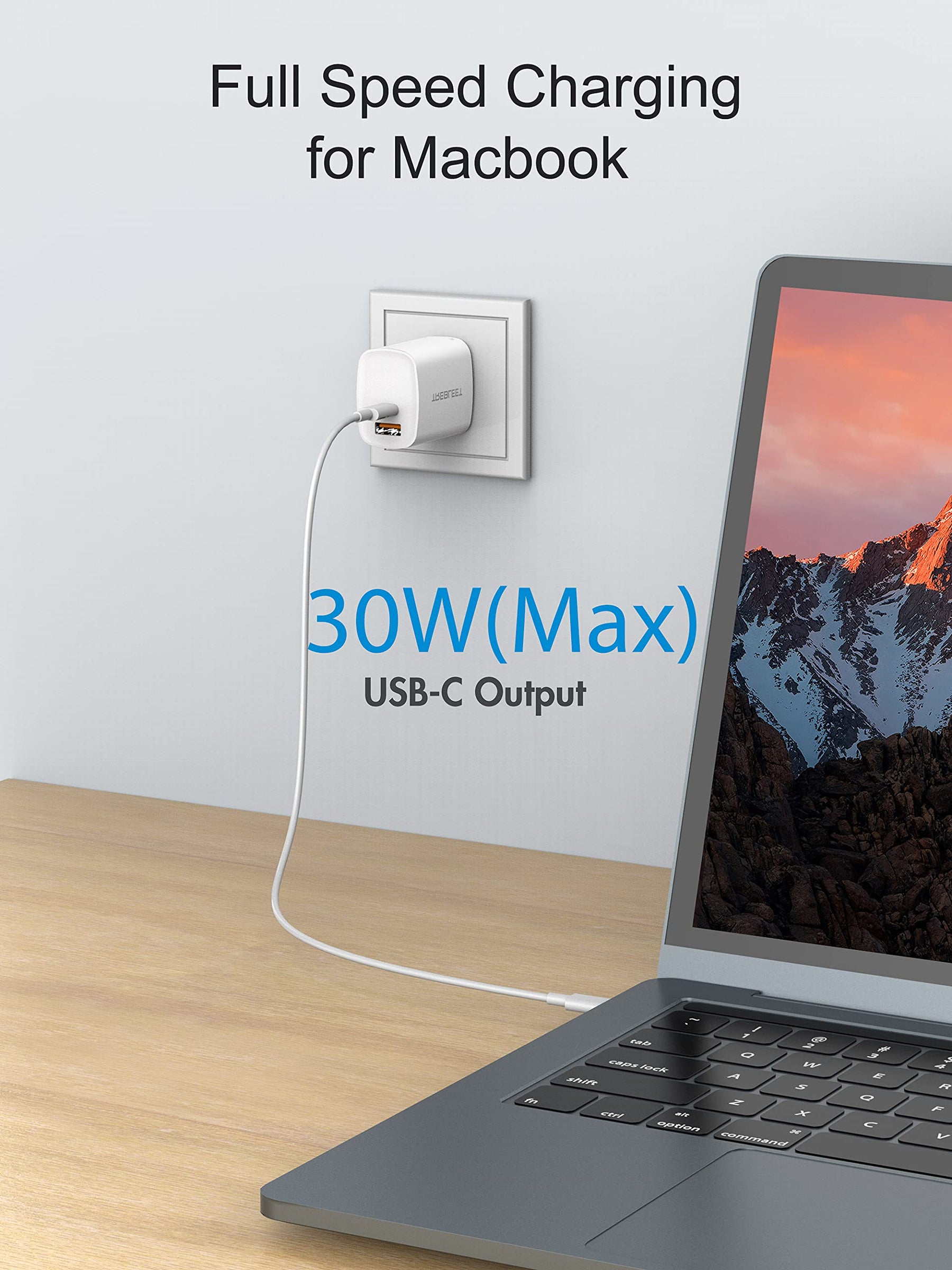 - [Fastest 30W Laptop Charging]Featured with speedy 30W (Max) output to virtually all devices, it powers up MacBook Air from 0% to 100% in just 2.1hrs, which surpasses other 20W or 25W chargers that cannot fuel laptops.(USB-C Port Only)
