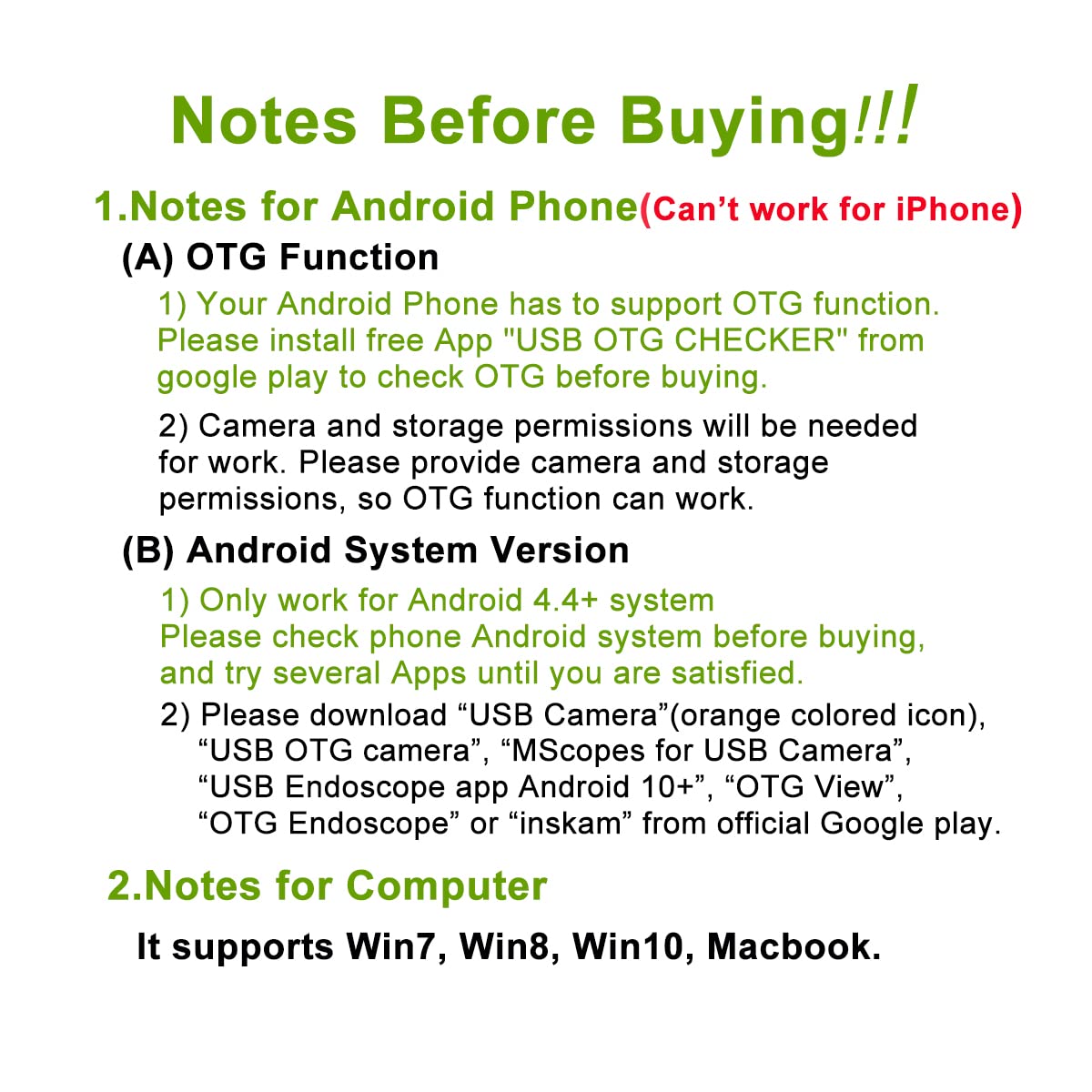 - USB Type-C Borescope for most USB C Android phones, such as: Samsung, HTC, Sony, it also works for most computers and Macbook(NOT for iPhone). Important note : It is applicable only to the USB C Smartphone with OTG and USB UVC function, you are suggested to install free app USB OTG CHECKER to check OTG before buying.