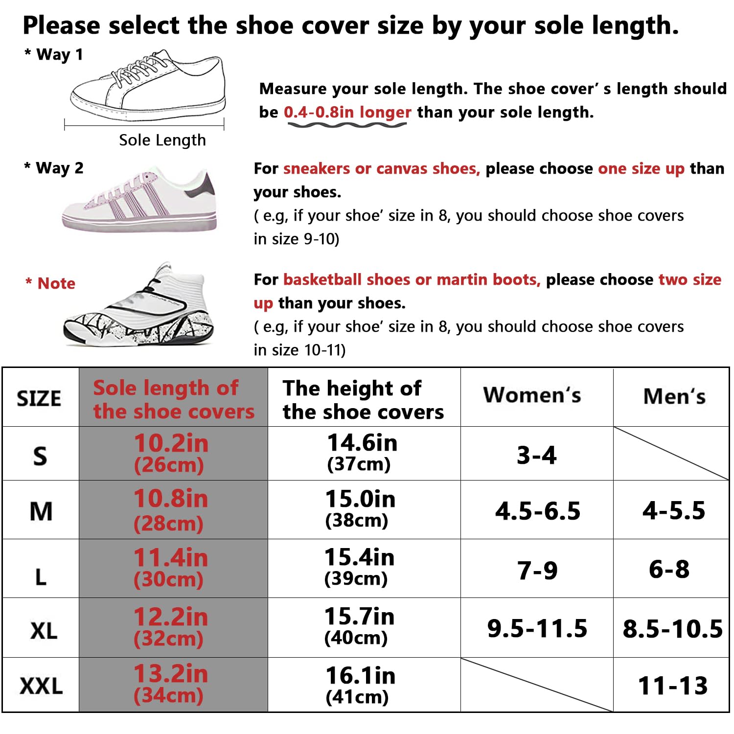 NOTE: There are five different sizes for optional, please measure your actual sole length before buying. We advise you to choose the size of shoe cover longer than your usual shoe sole length 0.5-0.8inch.