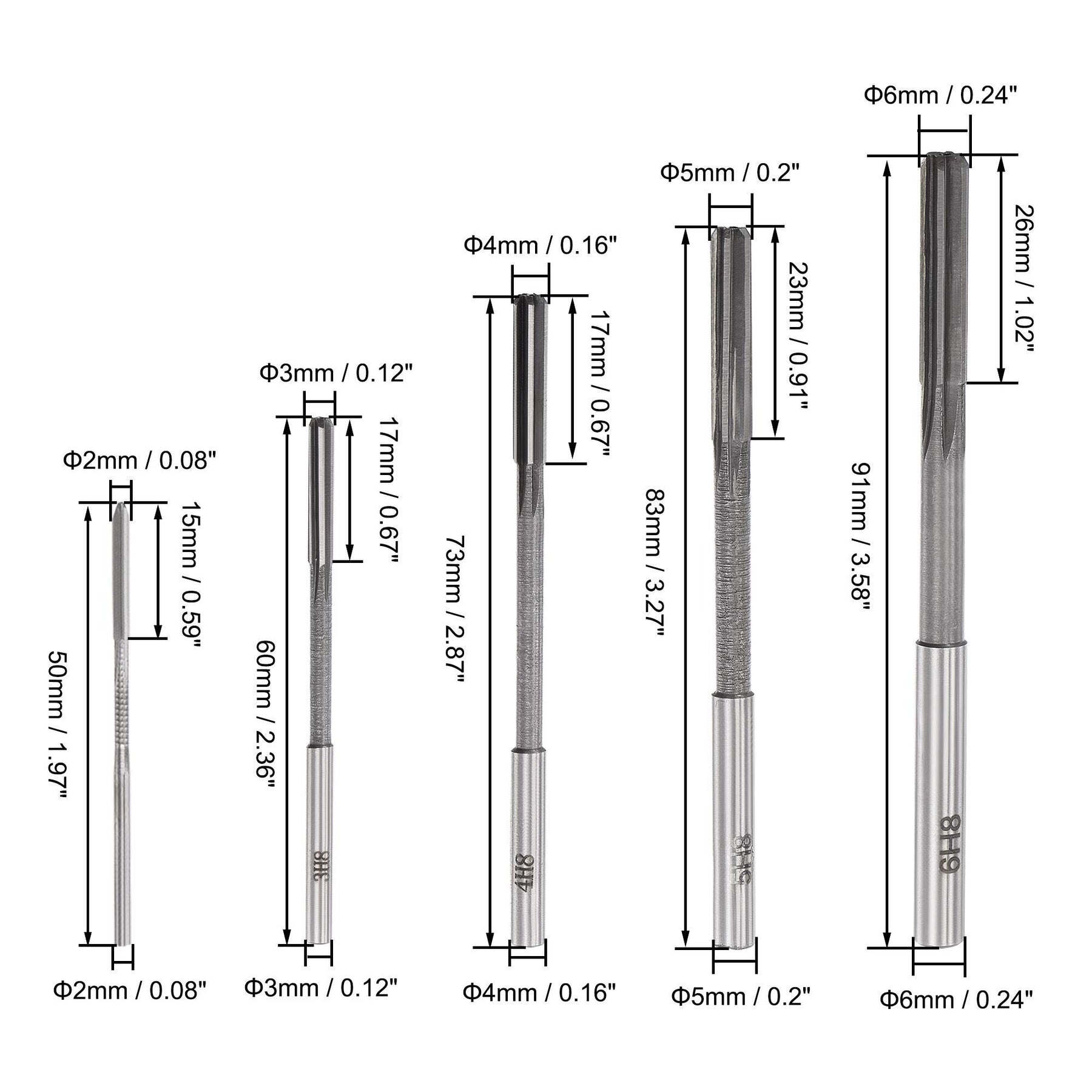 Flute Length: 15mm / 0.59"; 17mm / 0.67"; 17mm / 0.67"; 23mm / 0.91"; 26mm / 1.02"; 32mm / 1.26"; 34mm / 1.34"; 36mm / 1.42"; 38mm / 1.5"