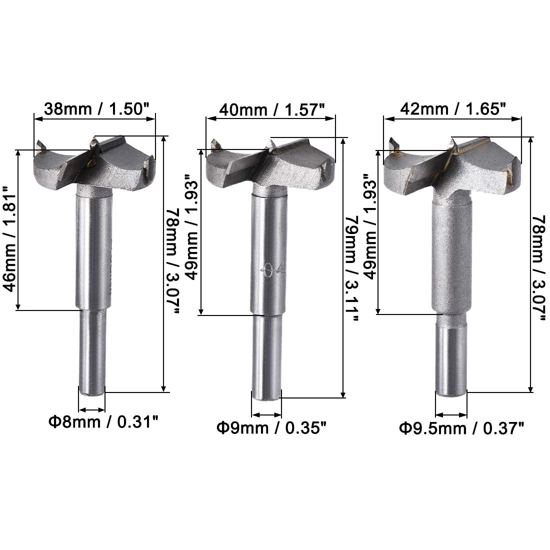 - Original Forstner Drill Bits – Forstner Wood Boring Drill Bits 38mm 40mm 42mm Dia. Hole Saw Carbide Alloy Steel Tip Round Shank Cutting for Hinge Plywood Wood Tool 3in1 Set by uxcell