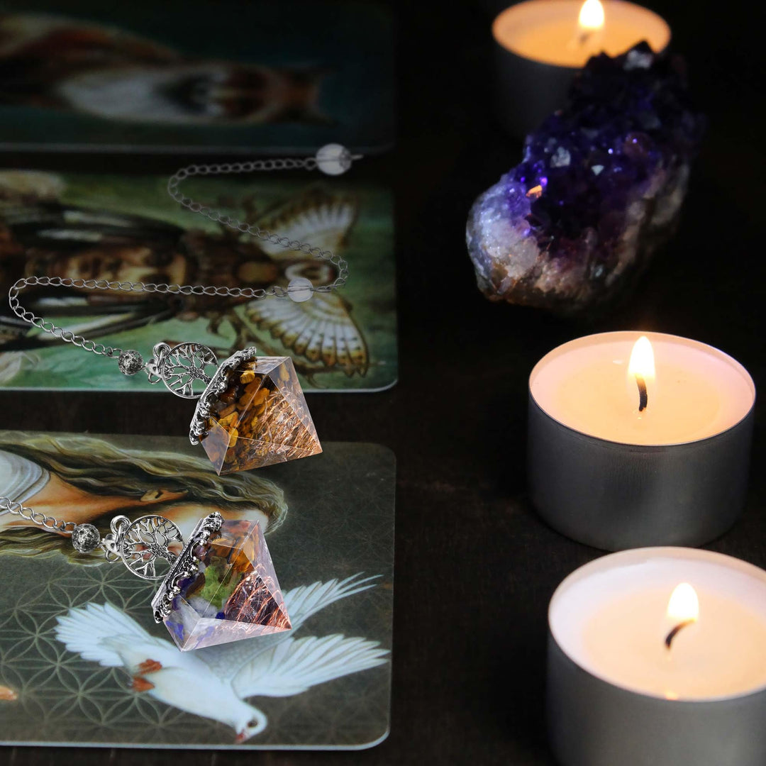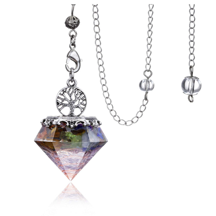 - [Reiki Crystals Pendulum]: The pendulum is made of natural crystal chips, copper wires, and surface used of resin. With silver stainless steel chain and Life Tree symbol. This dimond shape pendulum is used for divination, dowsing, meditation, reiki charging, energy generator, wicca. Also good for wearers wanting to energy balance, cleanse their Chakra and to facilitate wise decision making.