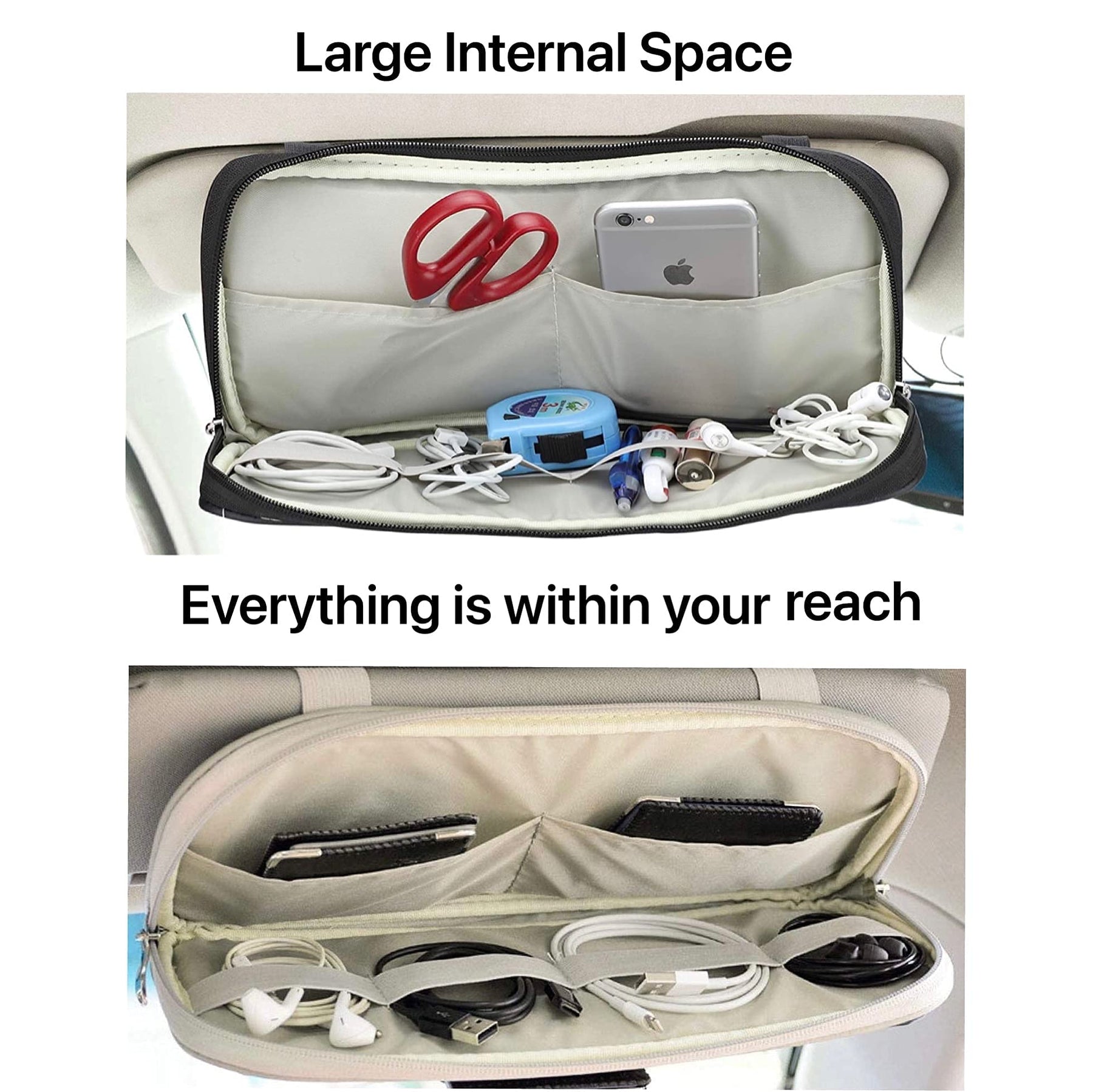 - Large Capacity and Multiple Pockets :1 zipper big compartment,5 card holder pockets,1 mesh deep slip pocket, and 1 Glasses clip.Perfectly for storing your phone, sunglasses, wires, documents, cards, pens, charger cord, earphones, CD and more. it is a great helper as storage bag for your car.