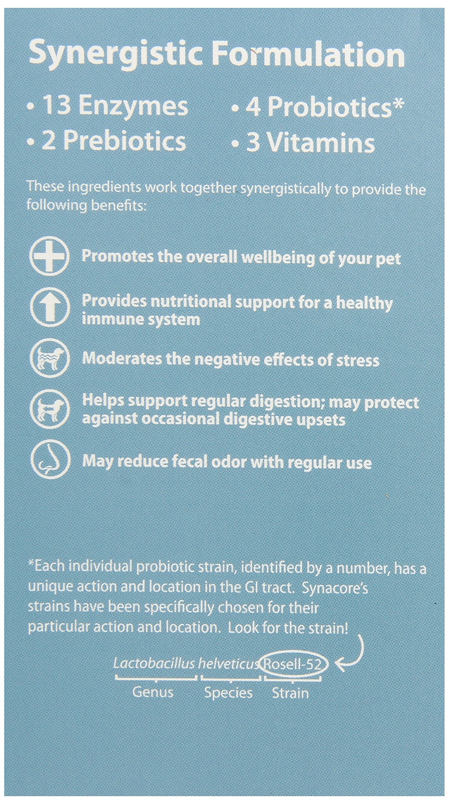 | included components | Synacore Canine Probiotics, Prebiotics, Vitamins, Enzymes - Box of 30 (2.5 g) stick pack |