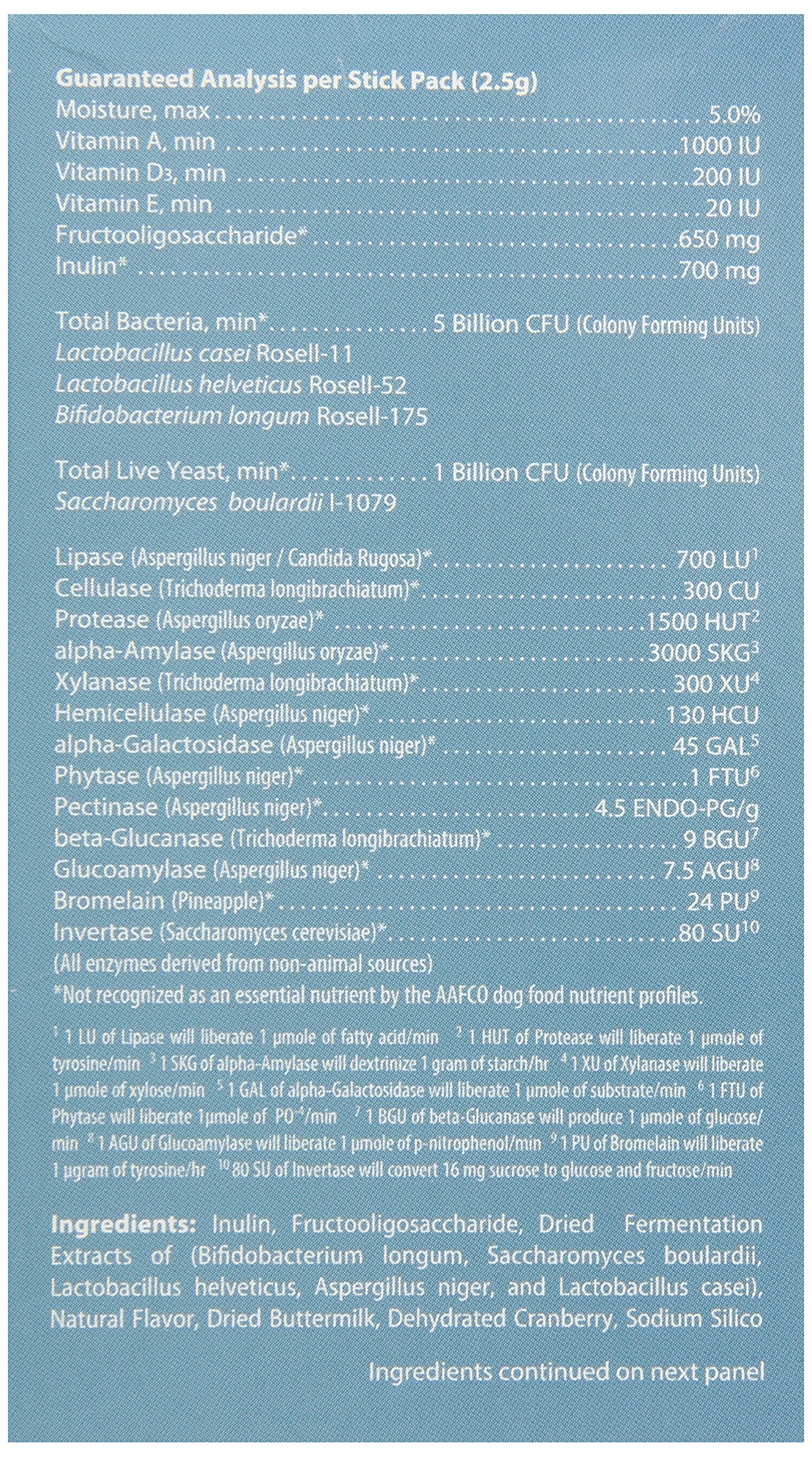 | ingredients | Inulin, Fructooligosaccharide, Dried Fermentation Extracts of (Bifidobacterium longum, Saccharomyces boulardii, Lactobacillus helveticus, Aspergillus niger, and Lactobacillus casei), Natural Flavor, Dried Buttermilk, Dehydrated Cranberry, Sodium Silico Aluminate, Dried Fermentation Extracts of (Trichoderma longibrachiatum, Aspergillus oryzae, Candida rugosa, and Saccharomyces cerevisiae), dl-alpha Tocopheryl Acetate (Source of Vitamin E), Bromelain, Vitamin A Acetate, Cholecalciferol (Source of Vitamin D3), Vegetable Oil, Maltodextrin, Ascorbic Acid. |