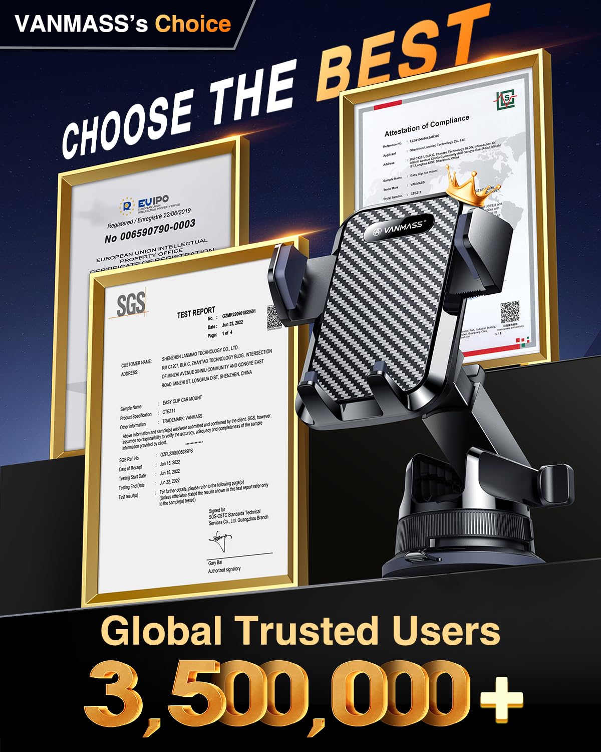 - BEST Newest Car Phone HolderVANMASS's best car phone mount with the highest rating! Preferred by 3,500,000+ Customers; Designed by world-class professional team; enjoy EUIPO Patent (No.007708805-0001), Military-grade certificate (No. GZMR220601855501), CP65/REACH/ROHS; 4,000+ kinds of material selection, 500+ suction cup upgrade designs, and 20,000 miles of road tests; giving birth to the best combo of the Flagship&Classic hoolder with newest suction cup