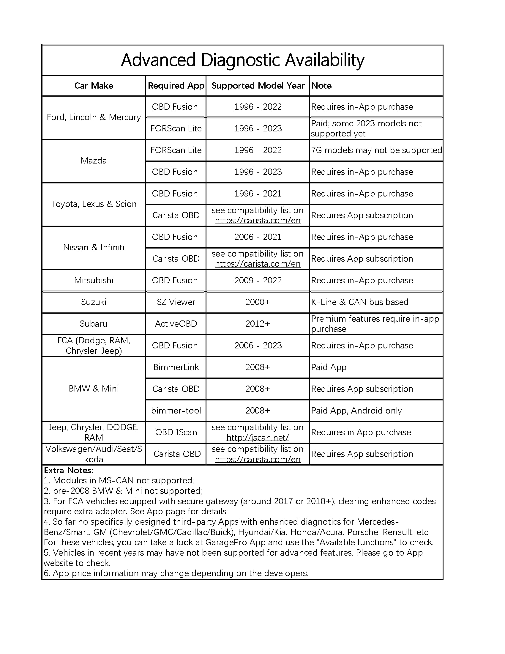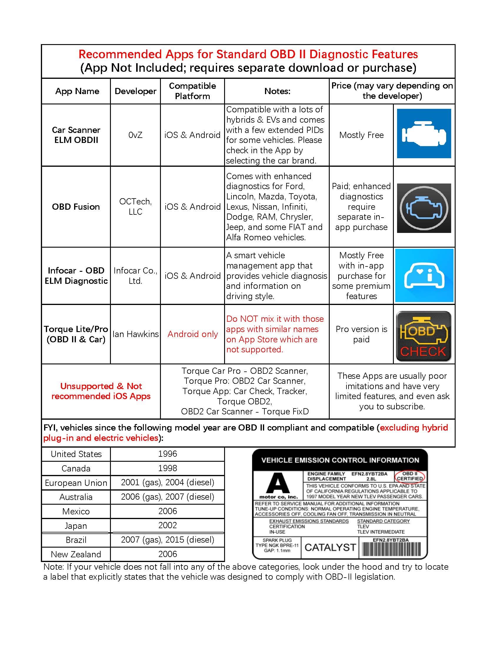 - VEHICLE COMPATIBILITY – Compatible with model year 1996 or newer cars and light trucks in the US and other OBD II/ EOBD compliant vehicles in other regions for generic check engine light diagnostic functions. For hybrid plug-in and electric vehicles, please check Car Scanner ELM OBD2 App and see if there is a suitable EV connection profiles, or other Apps designed specifically for EVs. To check if your vehicle is supported for advanced diagnostics (ABS, airbag, body control, etc.), please refer to the fourth image or “User guide (App & vehicle compatibility)” on the detail page.