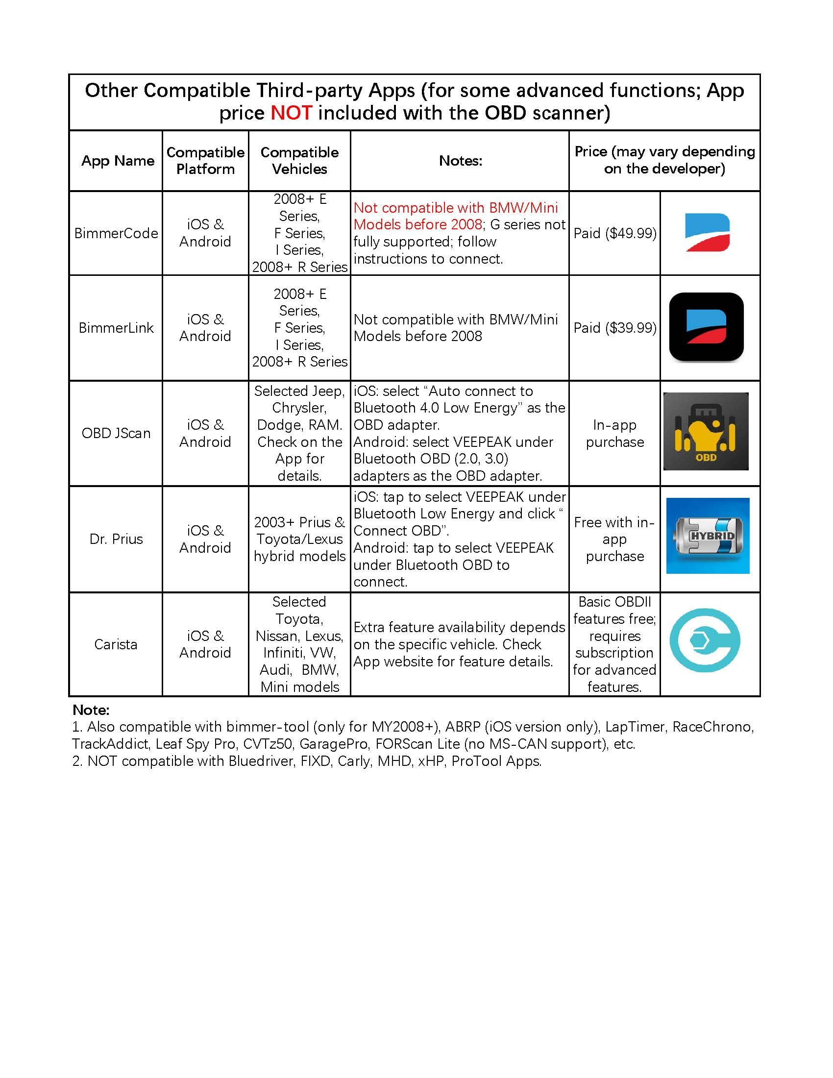 - Note: currently there is no Veepeak App coming with this device; third-party Apps are required but not included and requires separate download or purchase from Play Store or App Store (depending on your vehicle and needs); NOT compatible with Bluedriver, FIXD, Carly, MHD, xHP, ProTool Apps. Beware of low-quality apps with confusing names!